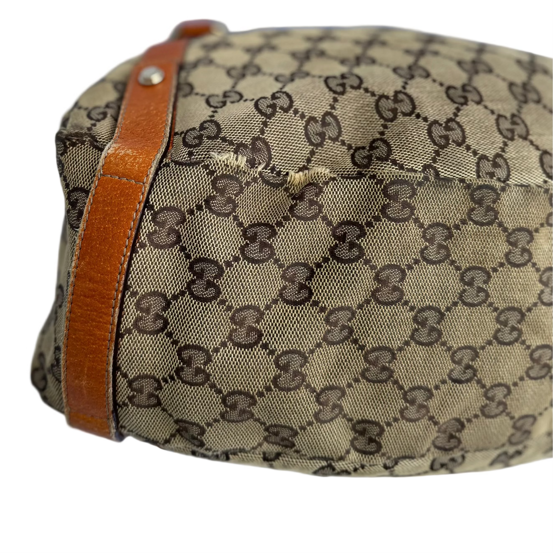 Condition Report - This bag has been previously owned and shows signs of use. There is a small hole on the side of the bag that does not affect functionality. Fraying is present to the canvas at the bottom creases of the bag, along with slight wear to the leather trim edges due to use. light staining to the GG canvas.