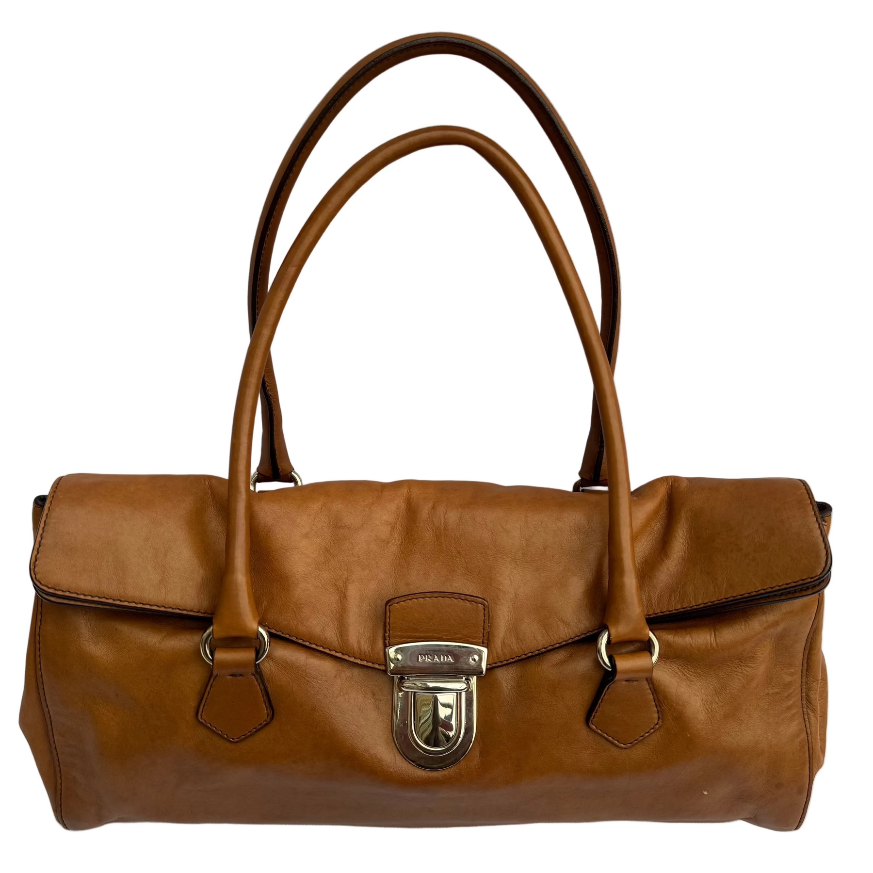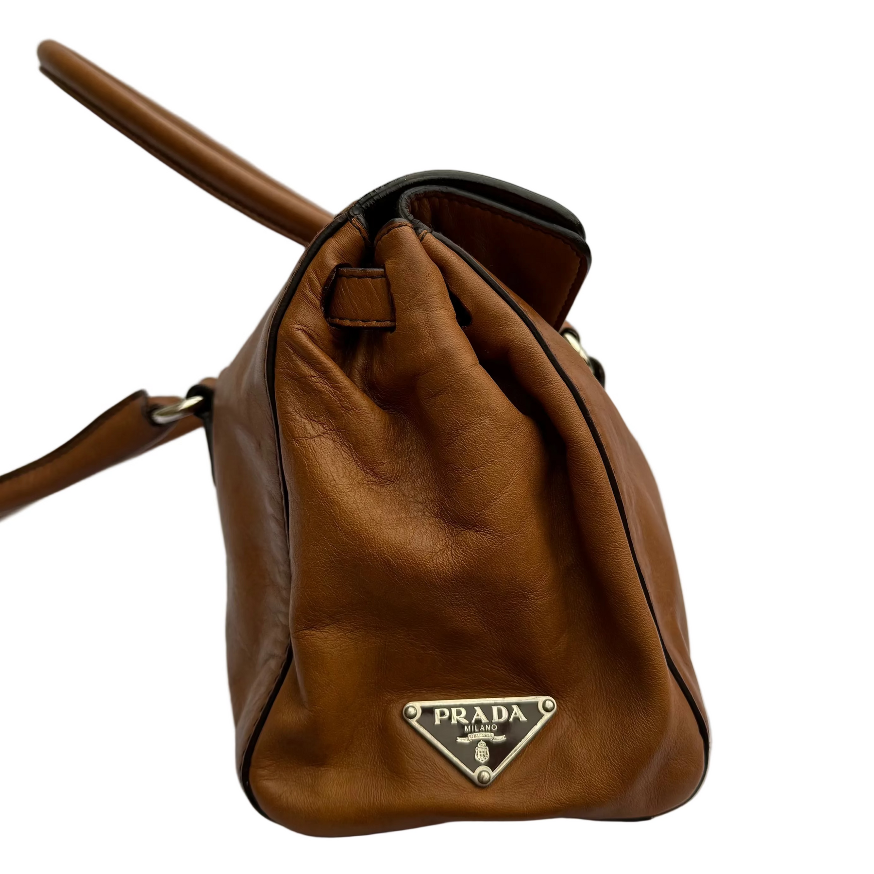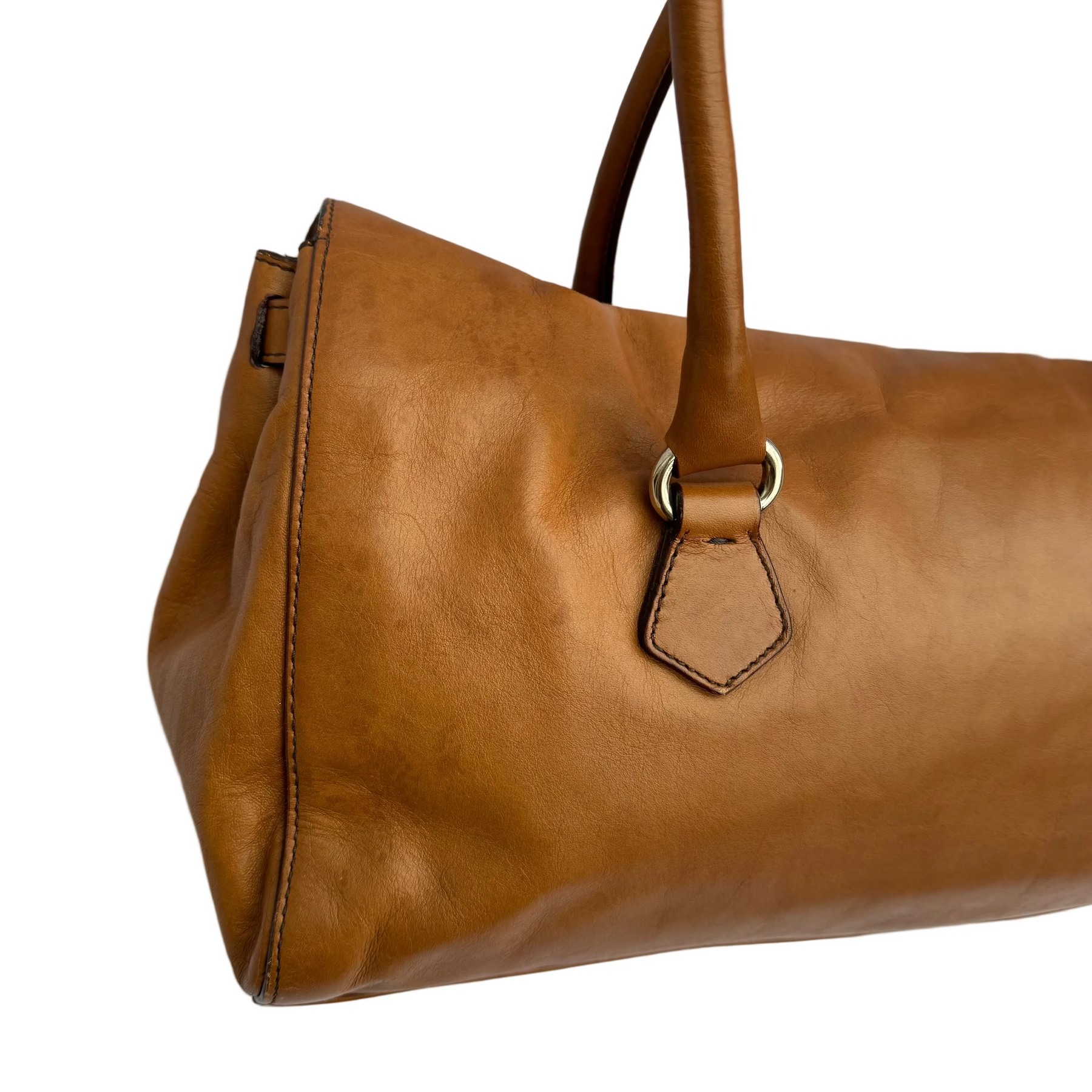 Details: A structured rectangular soft leather handbag in camel brown, featuring rolled top handles, adjustable side panels, and a polished silver lock closure. Versatile and effortlessly wearable from day to night.