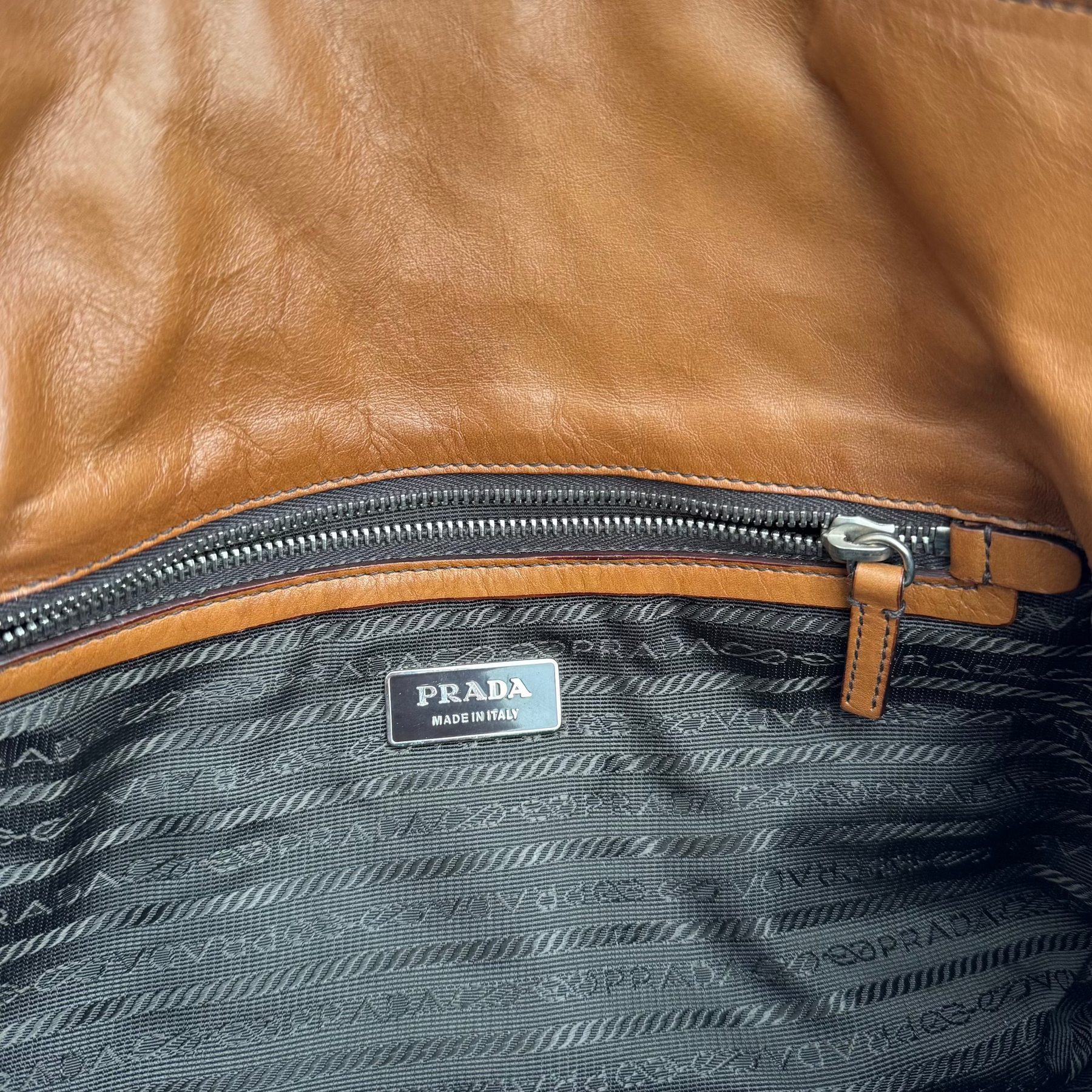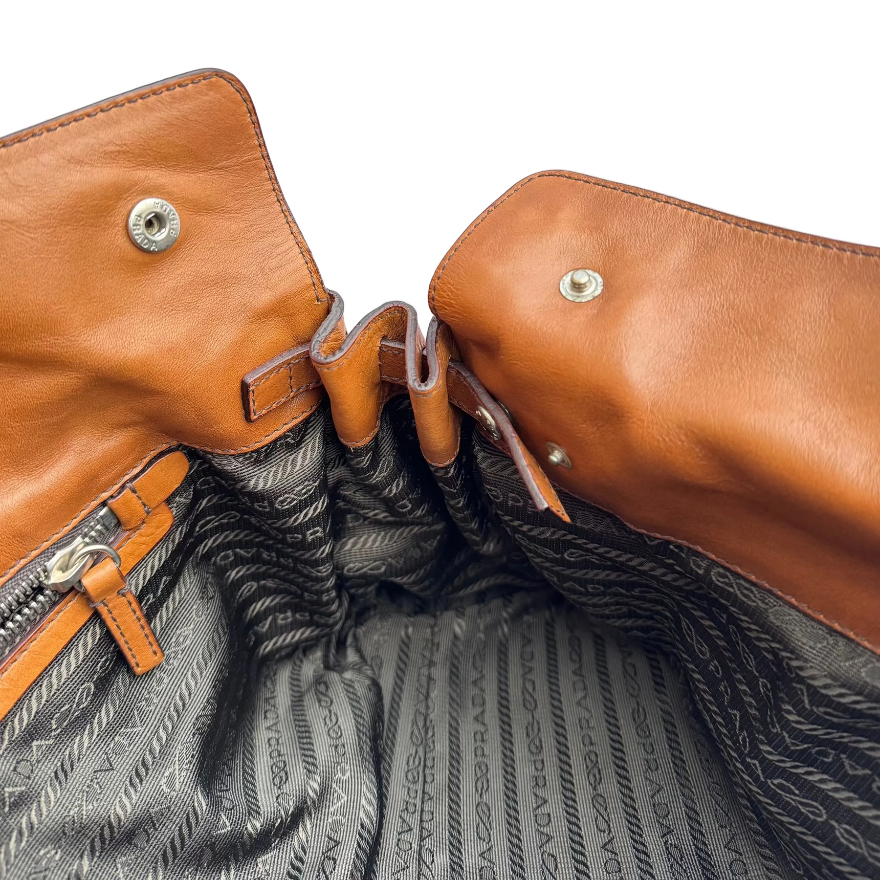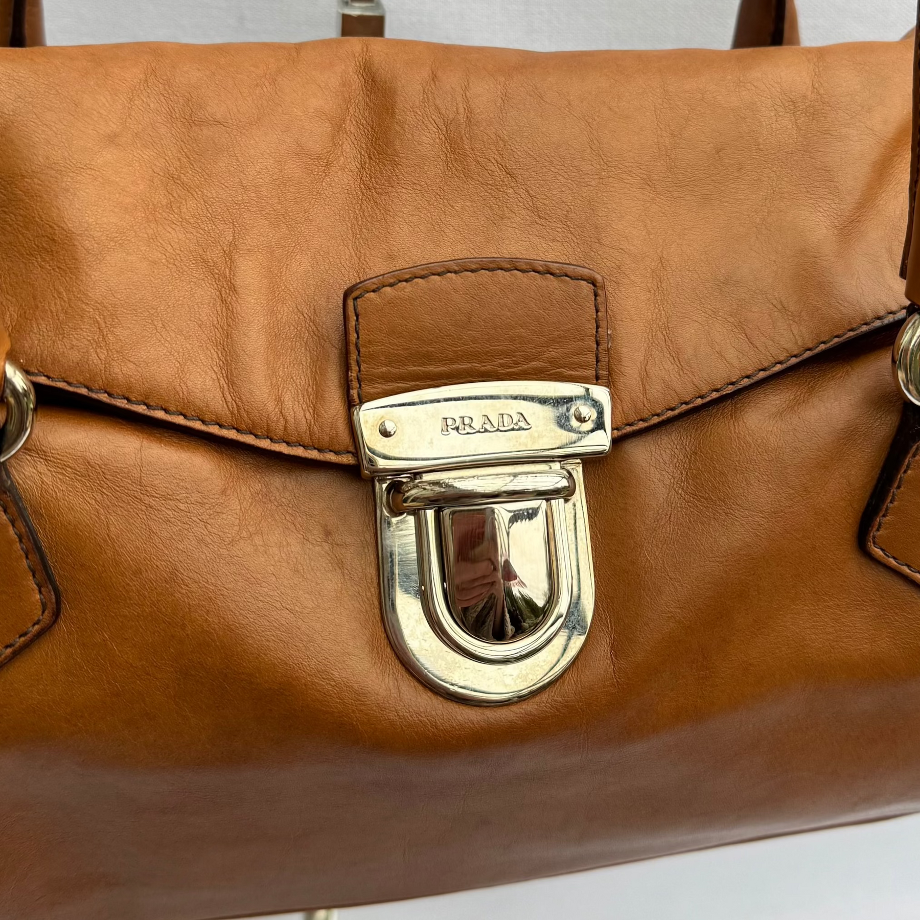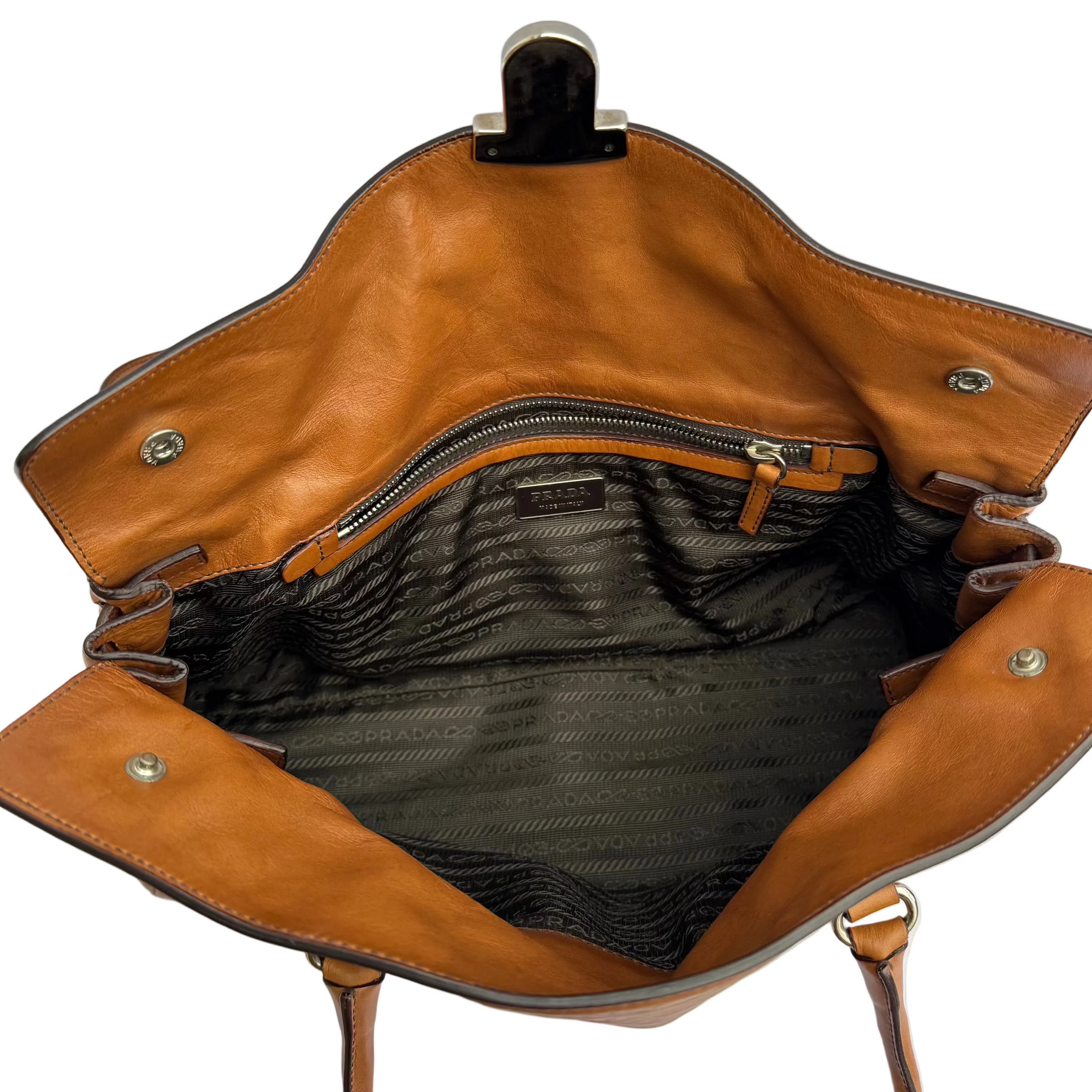 Details: A structured rectangular soft leather handbag in camel brown, featuring rolled top handles, adjustable side panels, and a polished silver lock closure. Versatile and effortlessly wearable from day to night.