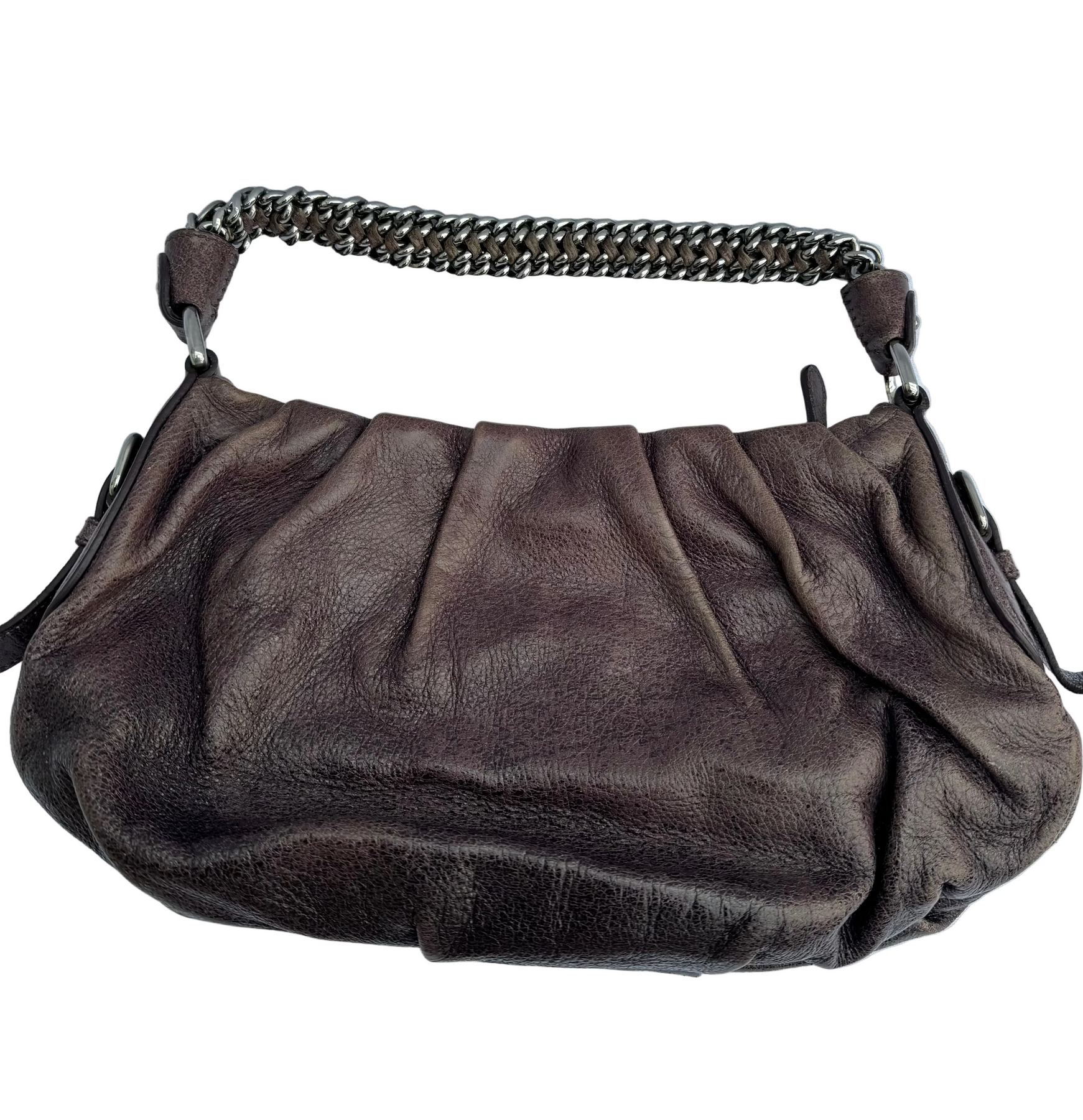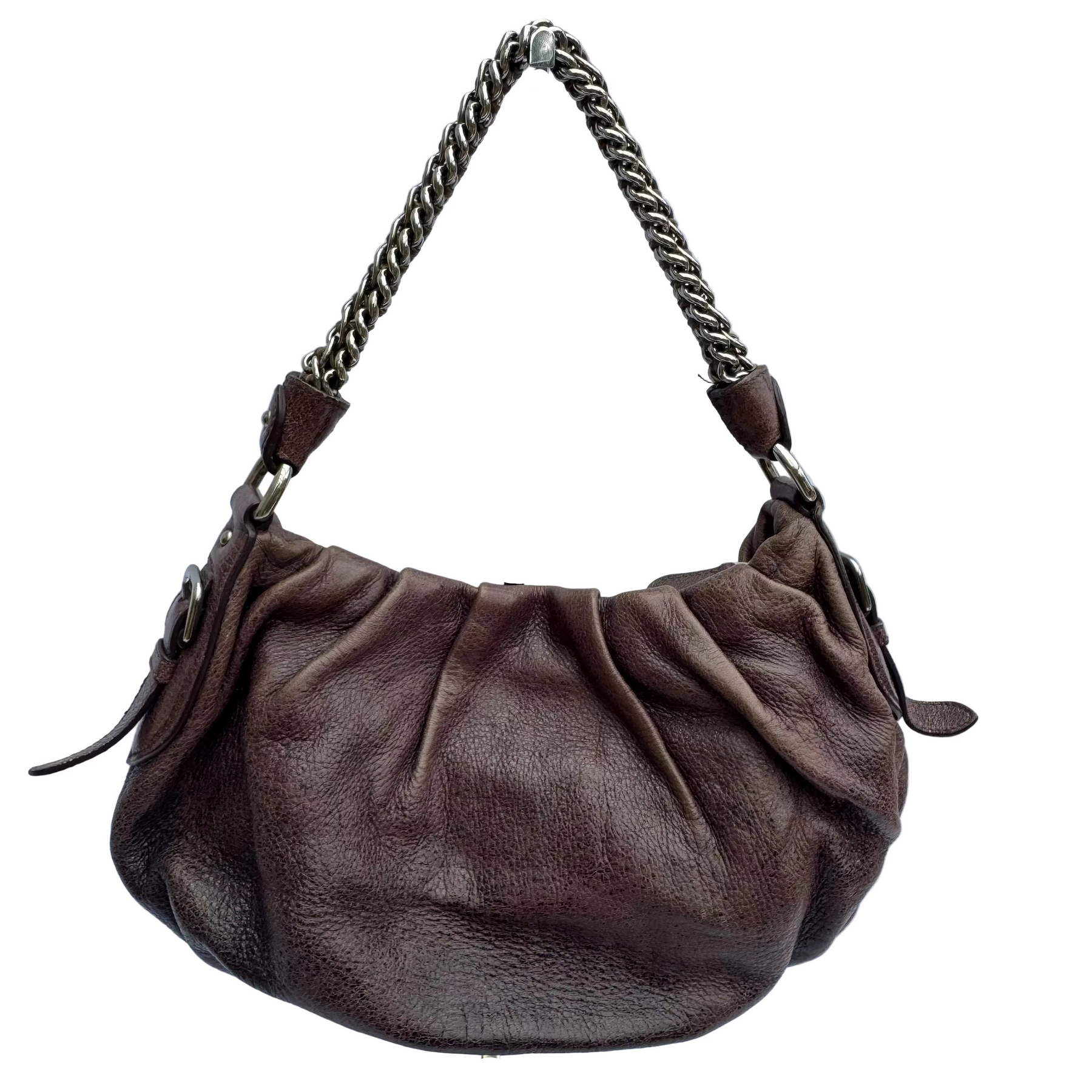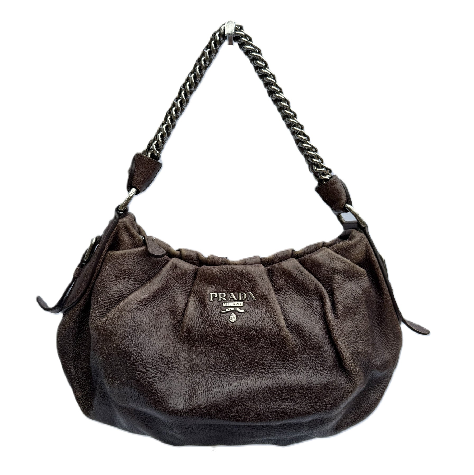 Details: Vintage Prada leather shoulder bag in rich brown features a soft, relaxed, slouchy silhouette. Finished with a statement silver chain strap and silver logo detailing, it transitions effortlessly from day to night. A timeless piece with chic luxury appeal.