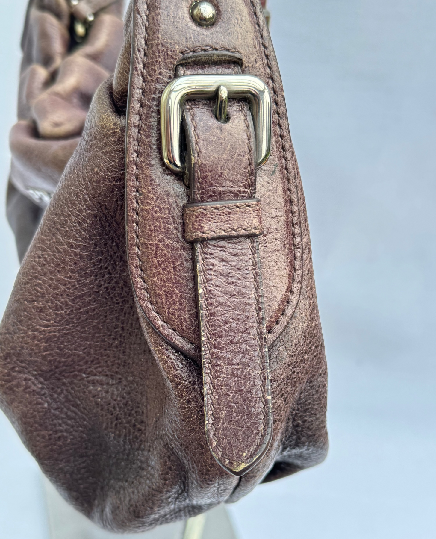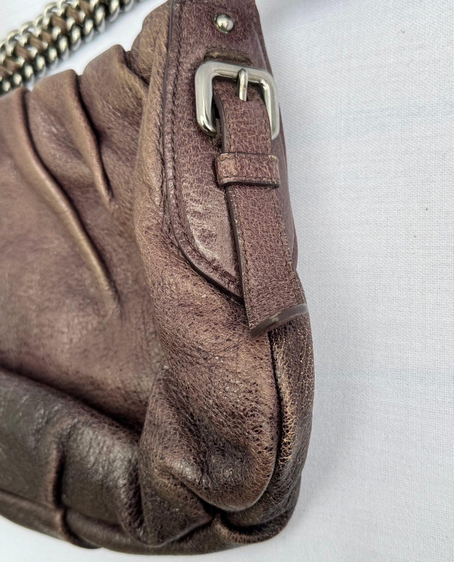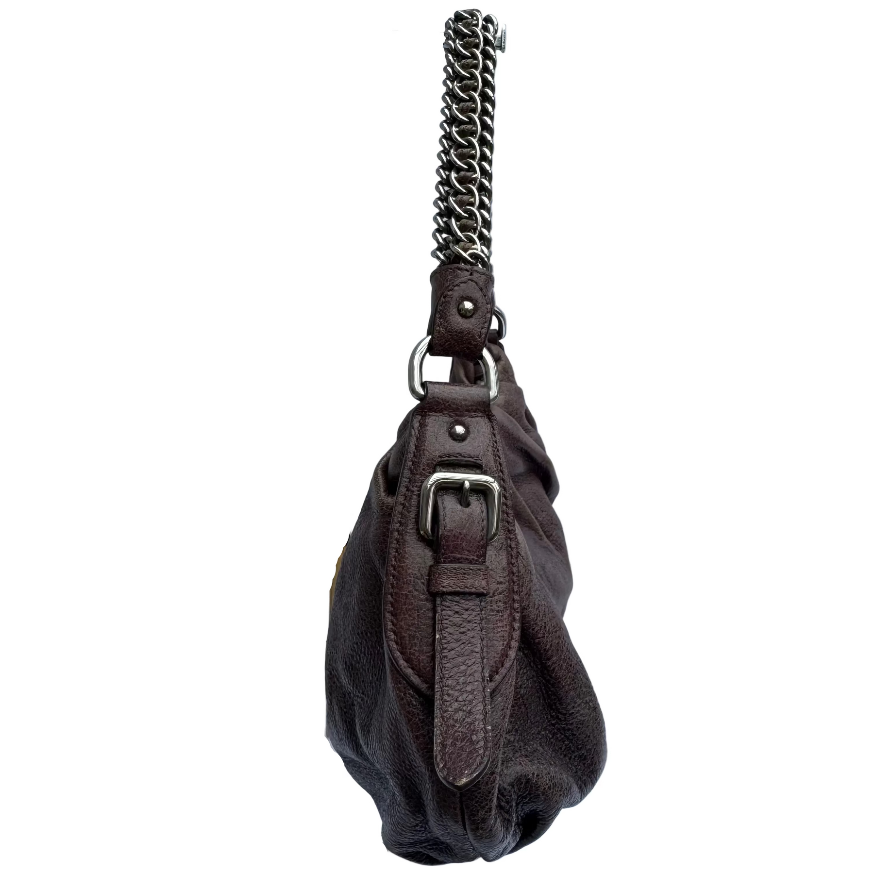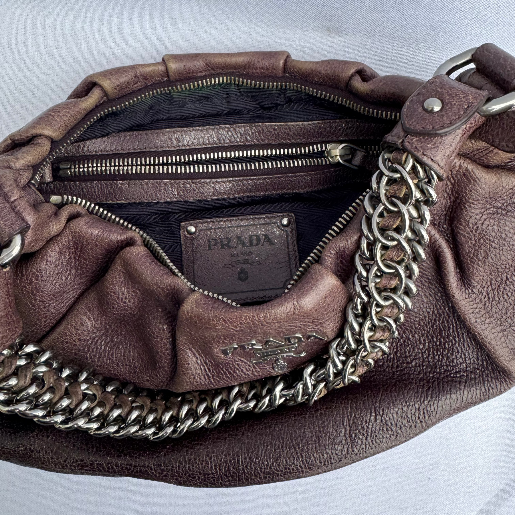 Details: Vintage Prada leather shoulder bag in rich brown features a soft, relaxed, slouchy silhouette. Finished with a statement silver chain strap and silver logo detailing, it transitions effortlessly from day to night. A timeless piece with chic luxury appeal.