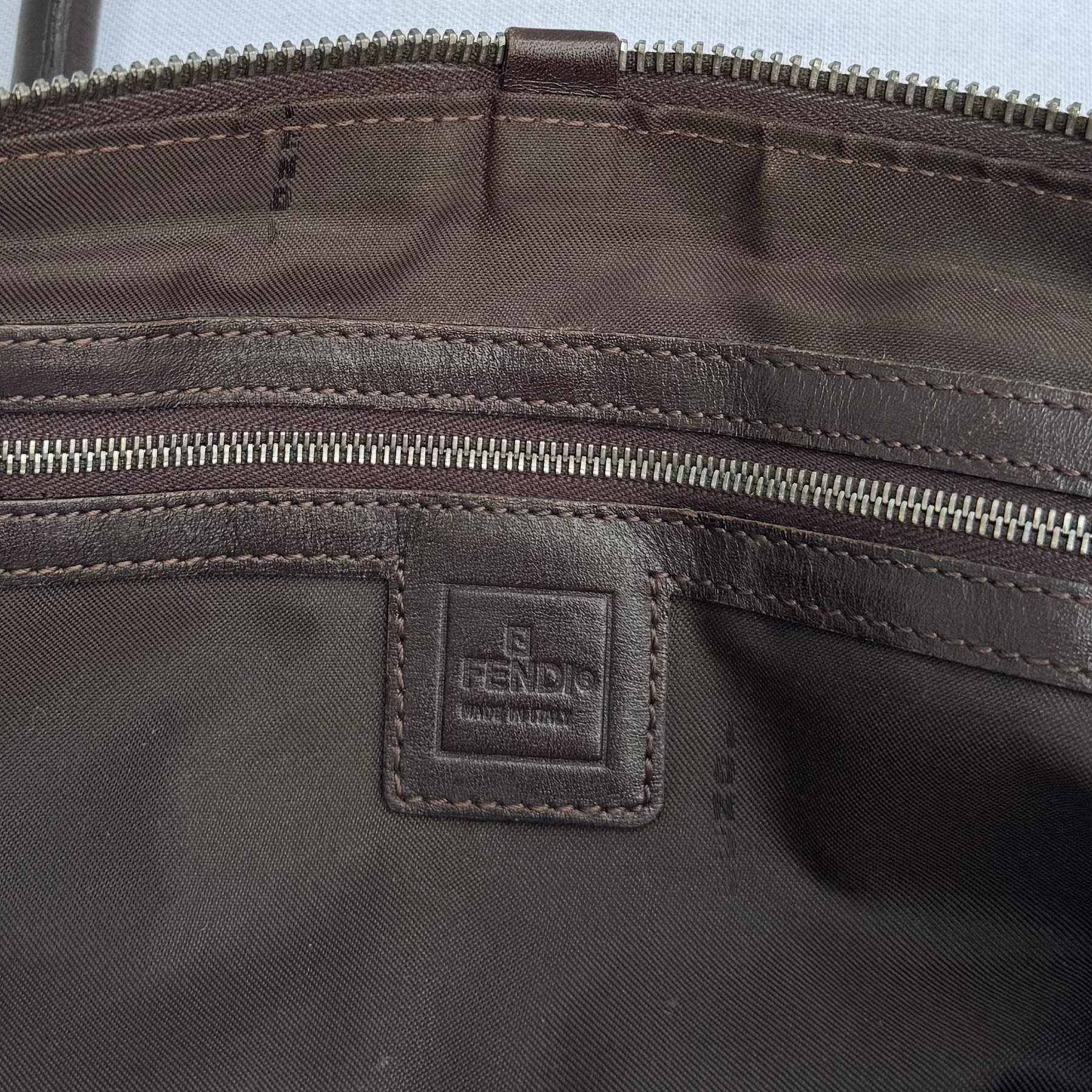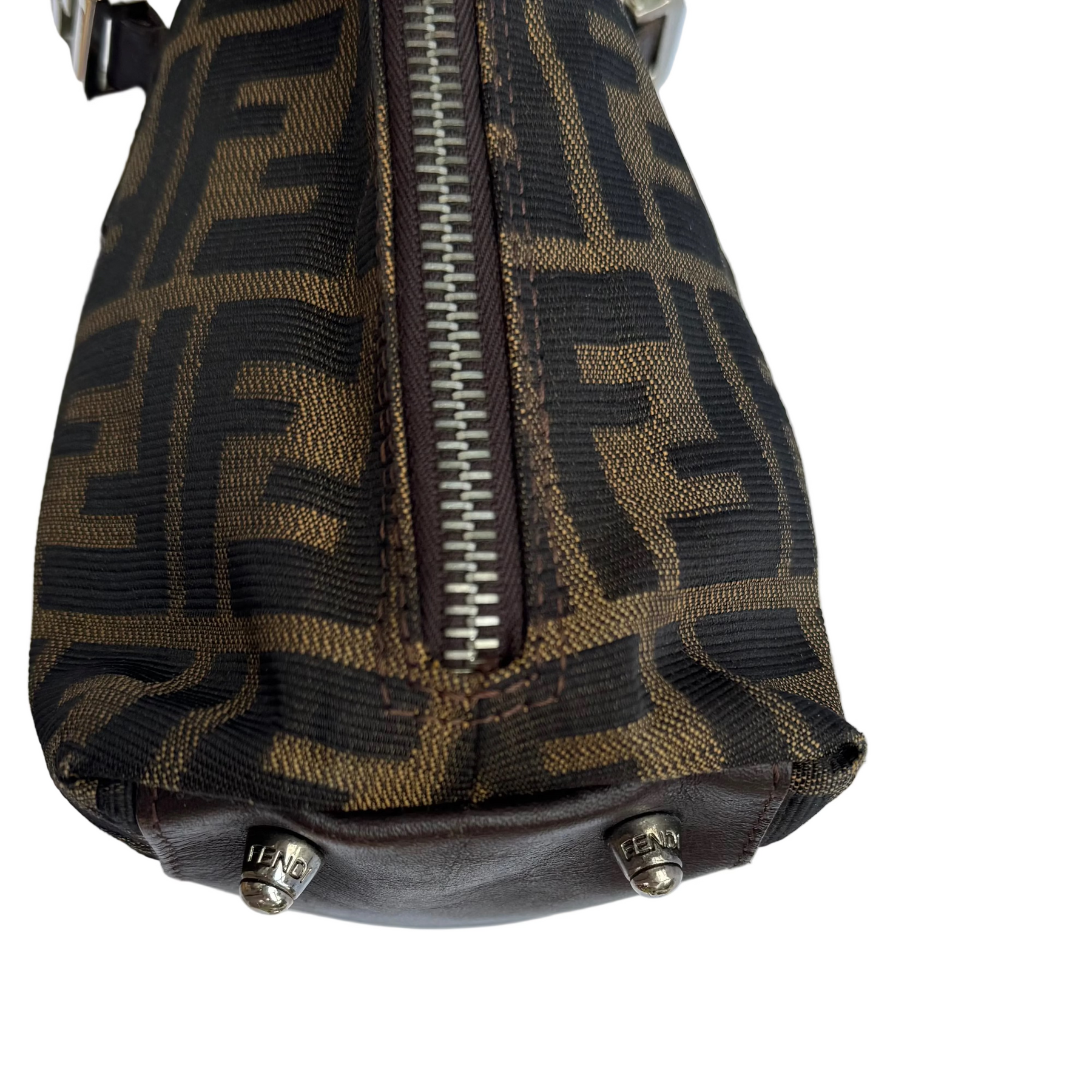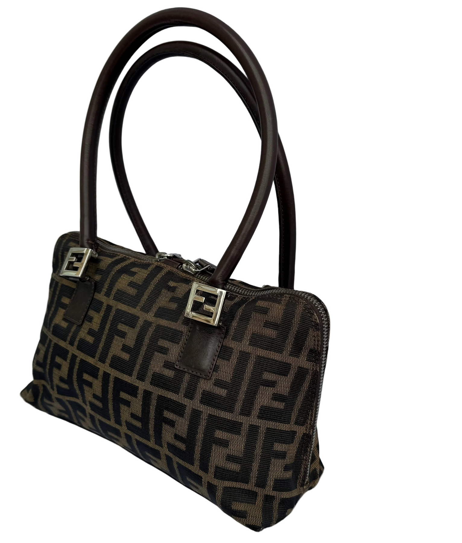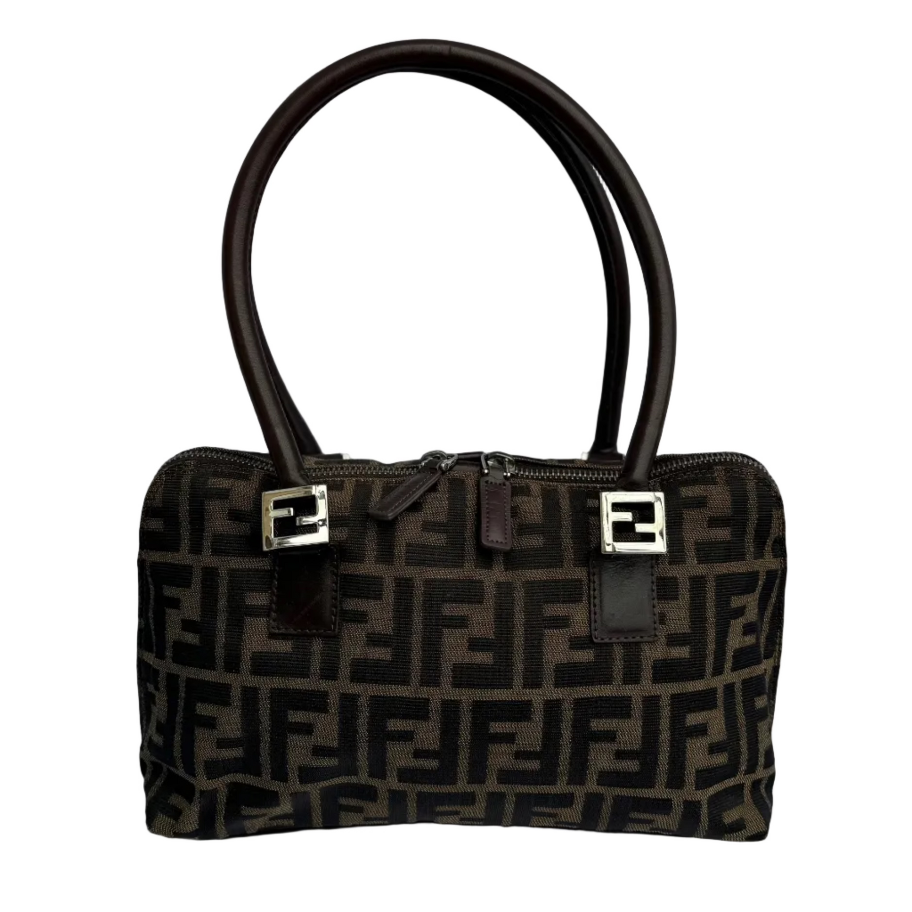 Details: Vintage Fendi Zucca handbag crafted in iconic brown monogram canvas with silver-tone hardware and rolled handles. Structured yet refined, with a spacious interior and dual zip closure. A timeless archive piece.