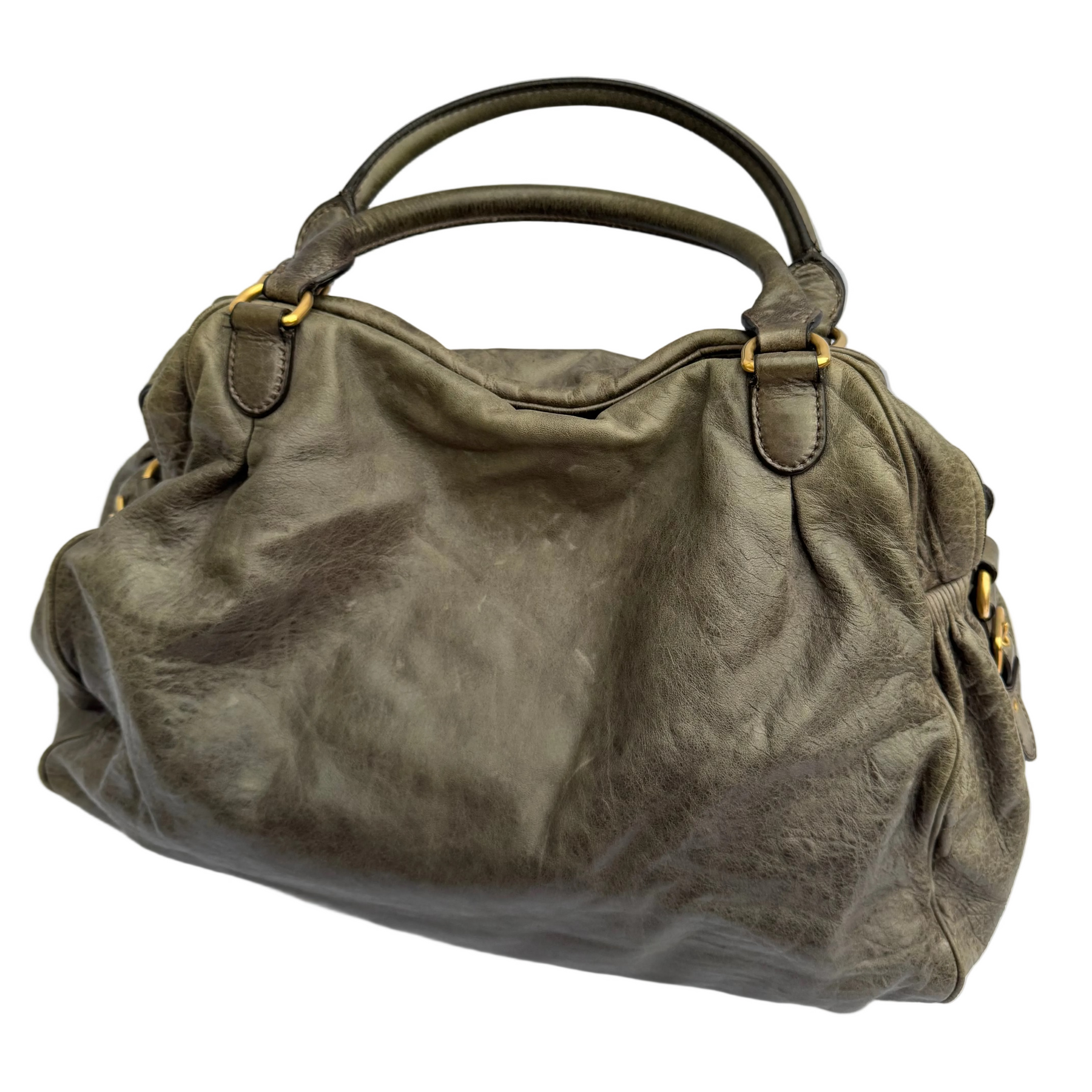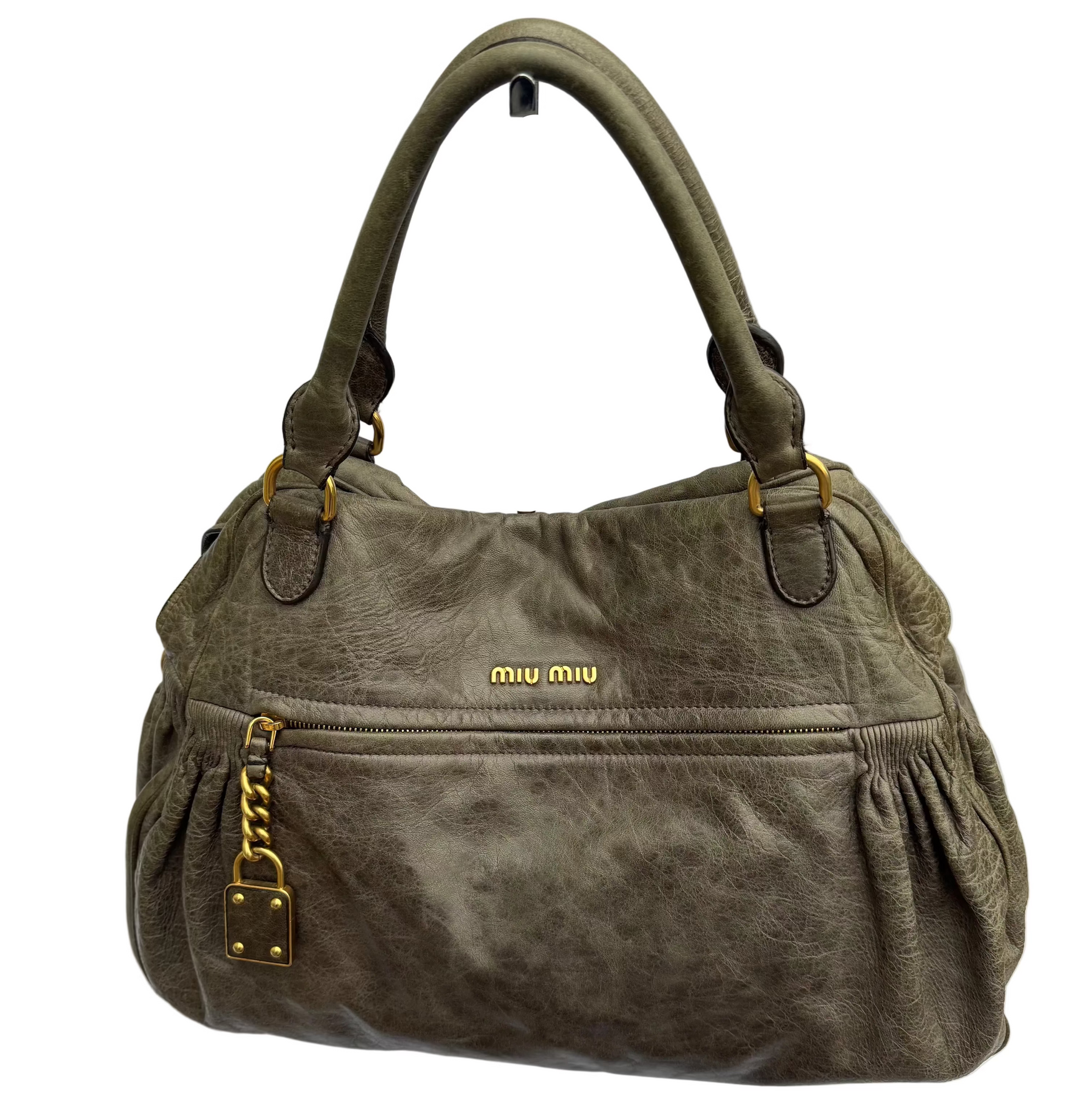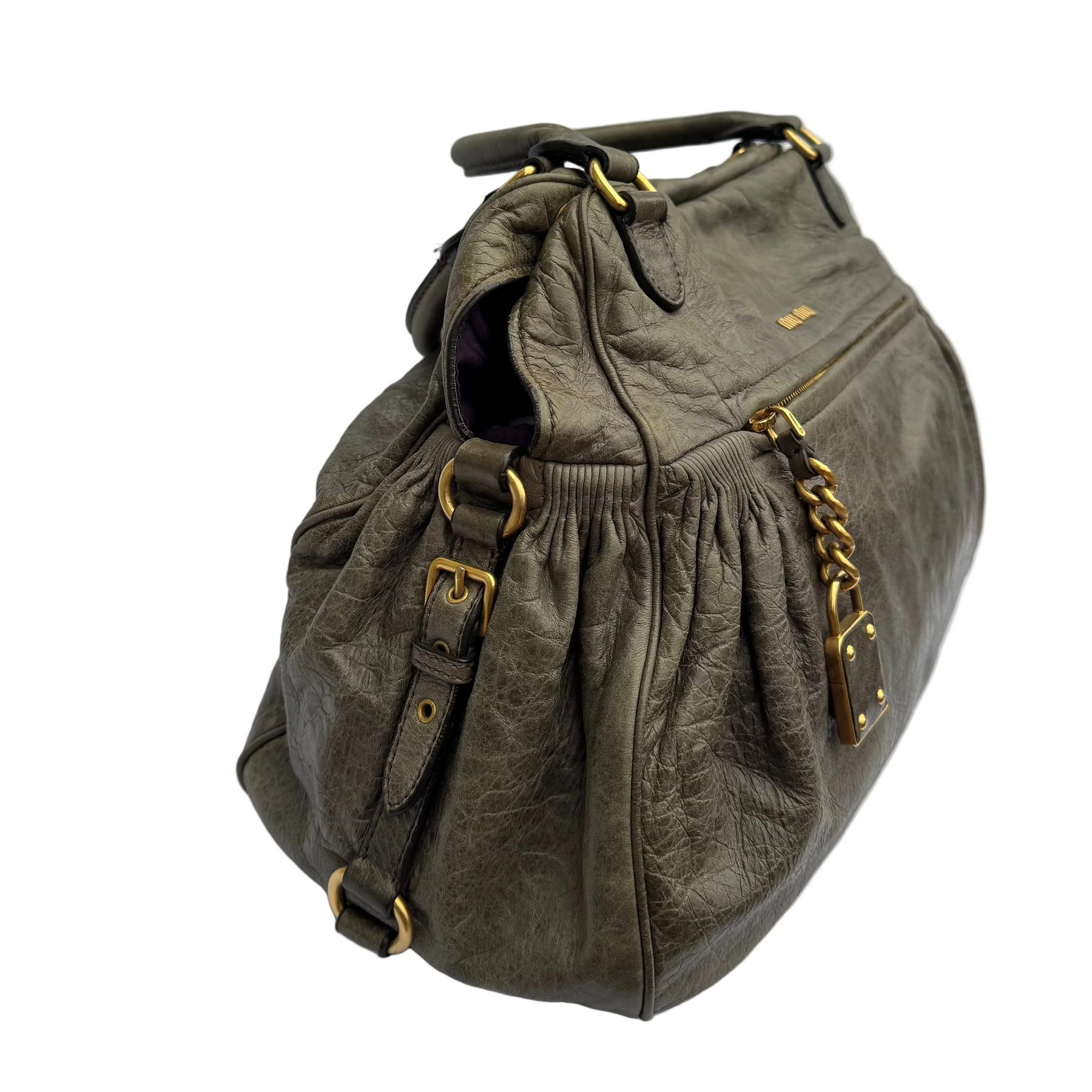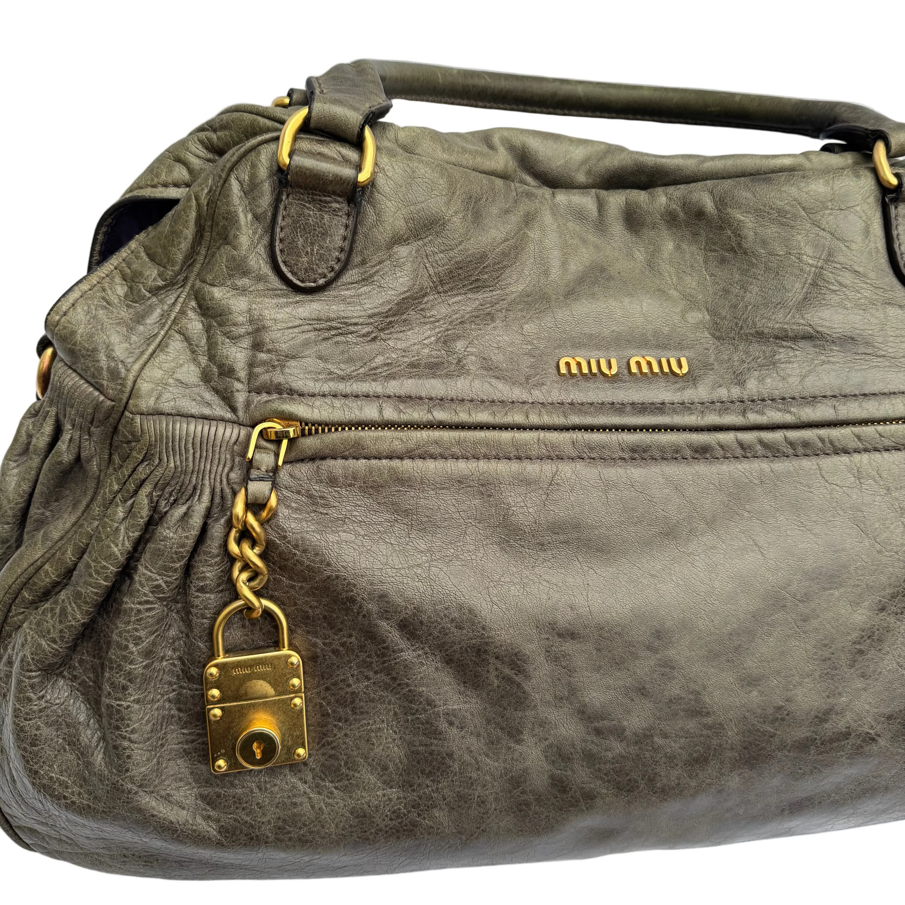 Model: Miu Miu Khaki Distressed Leather padlock Handle Bag in Grey
