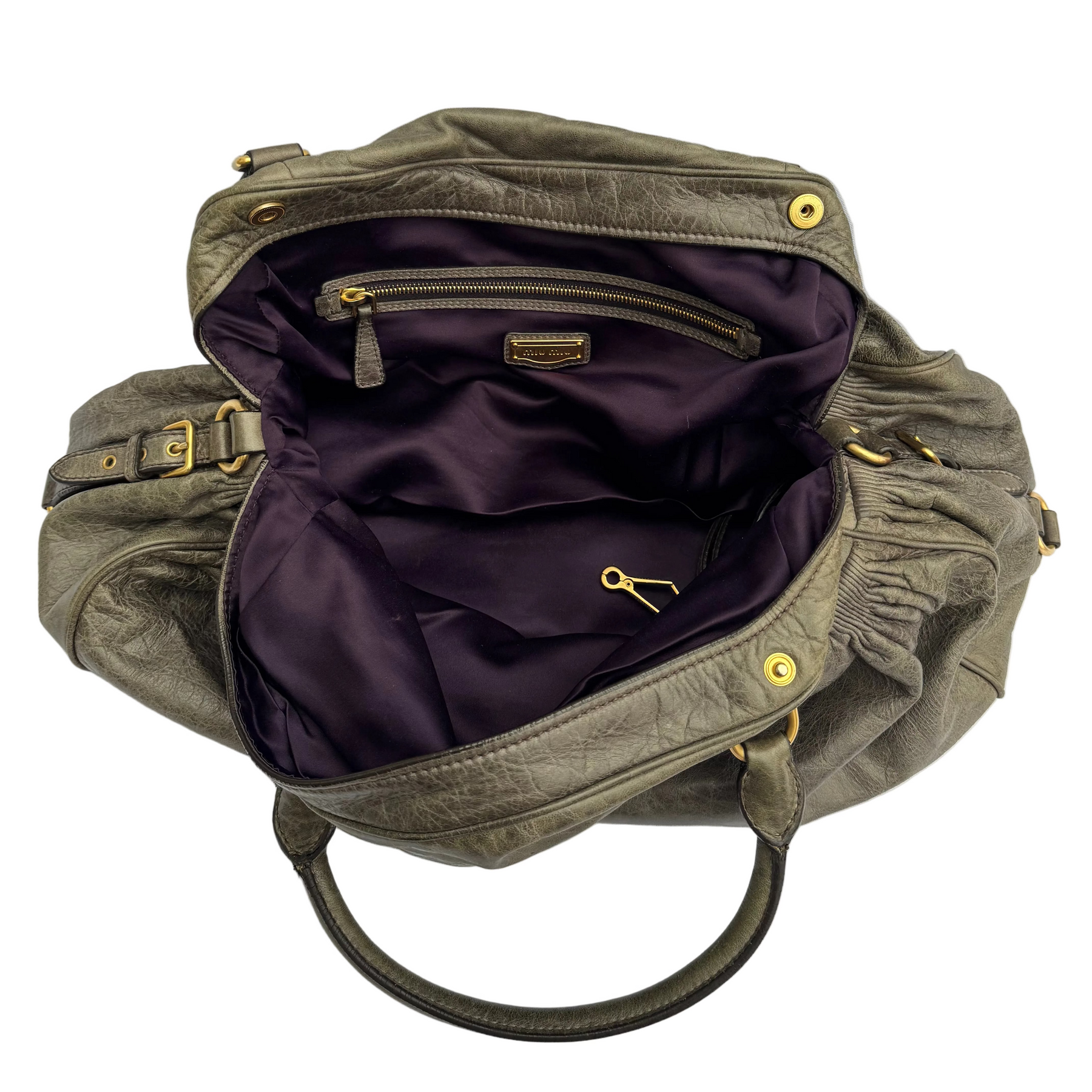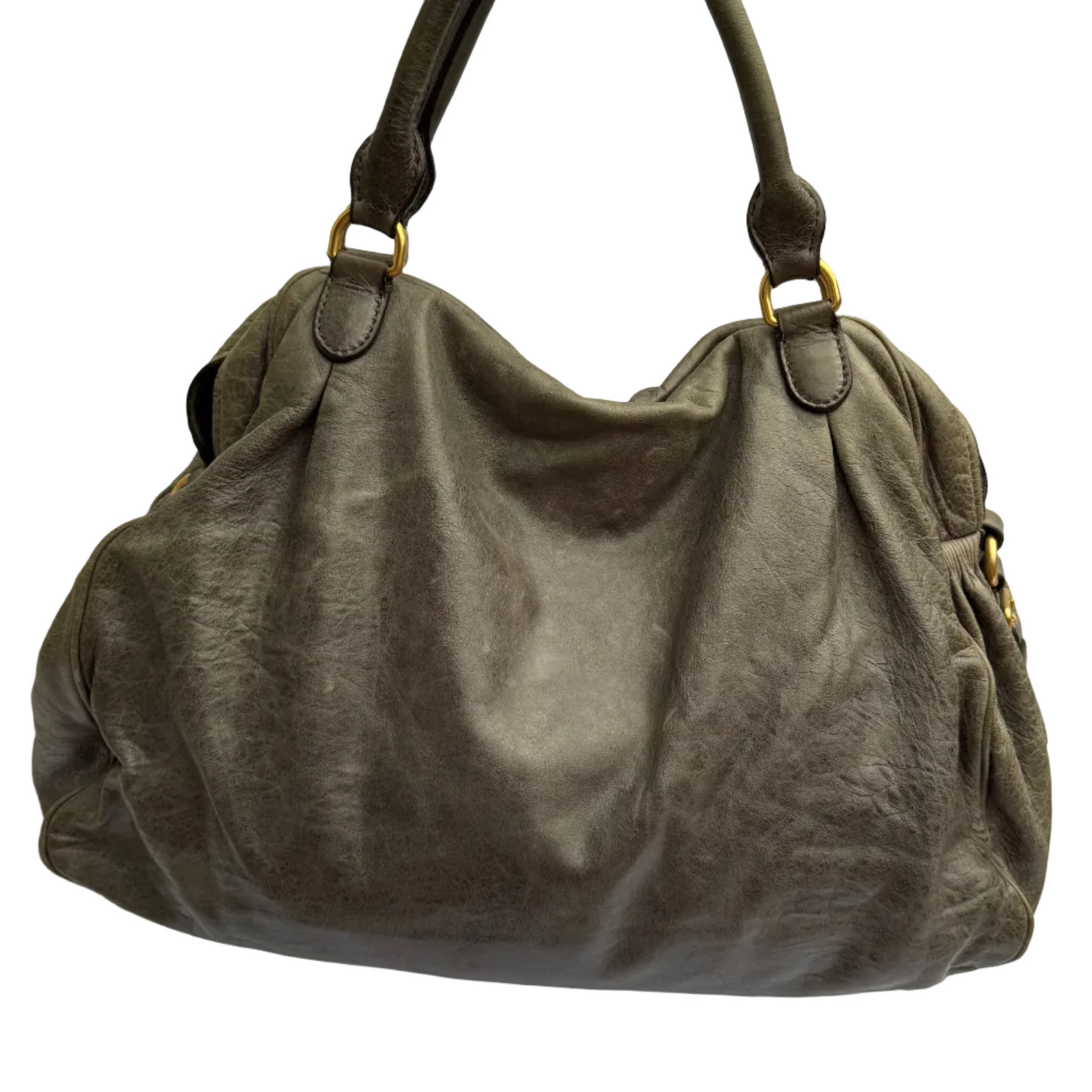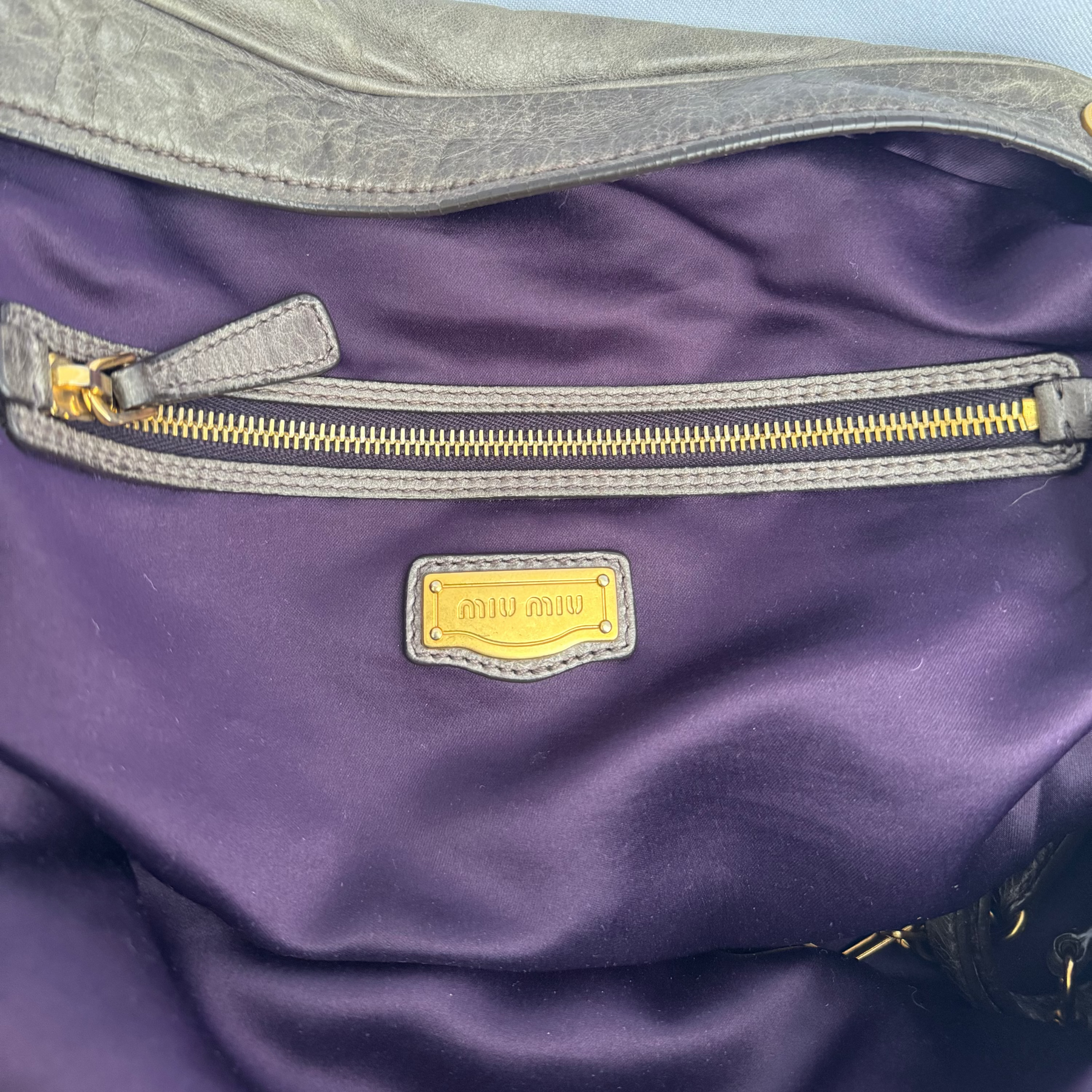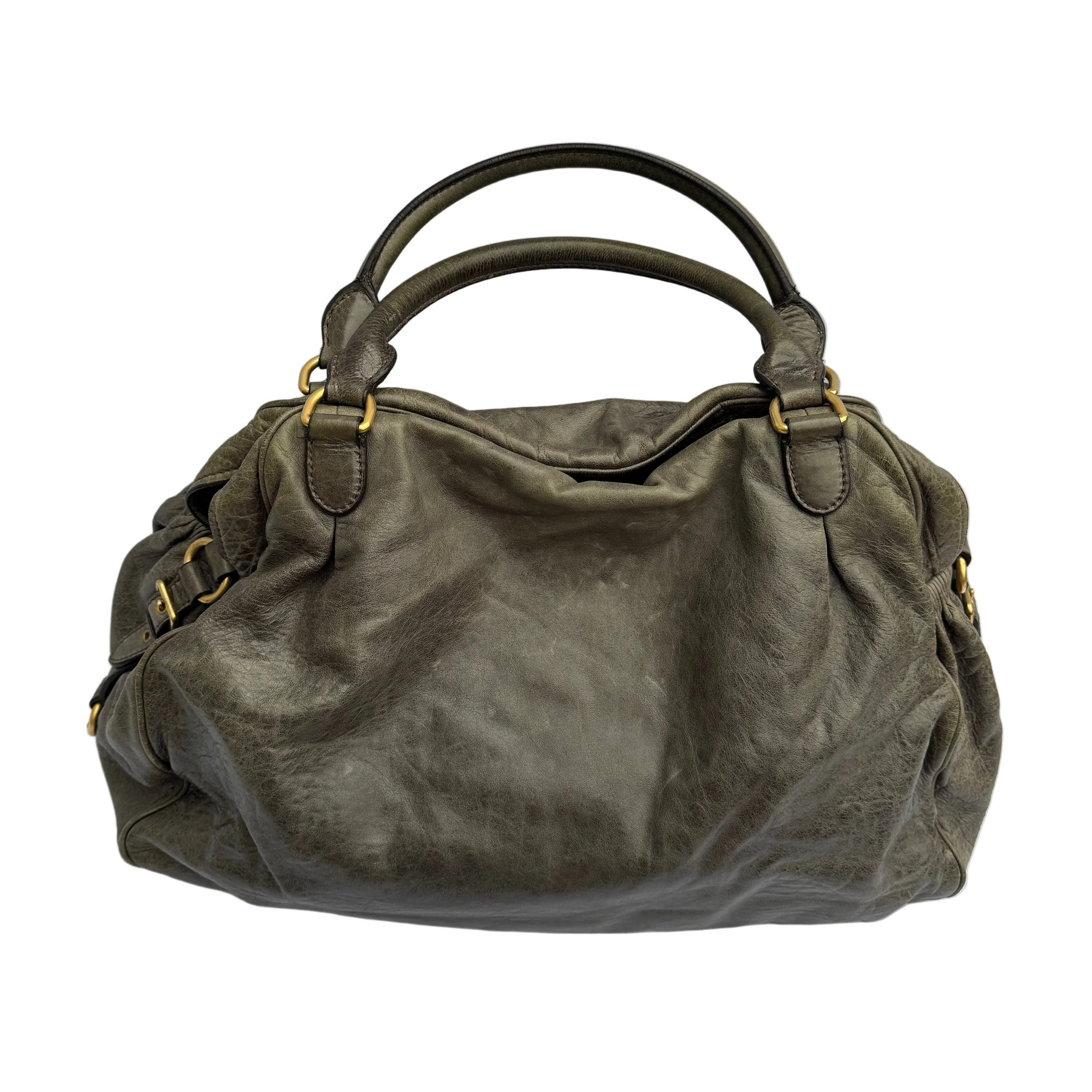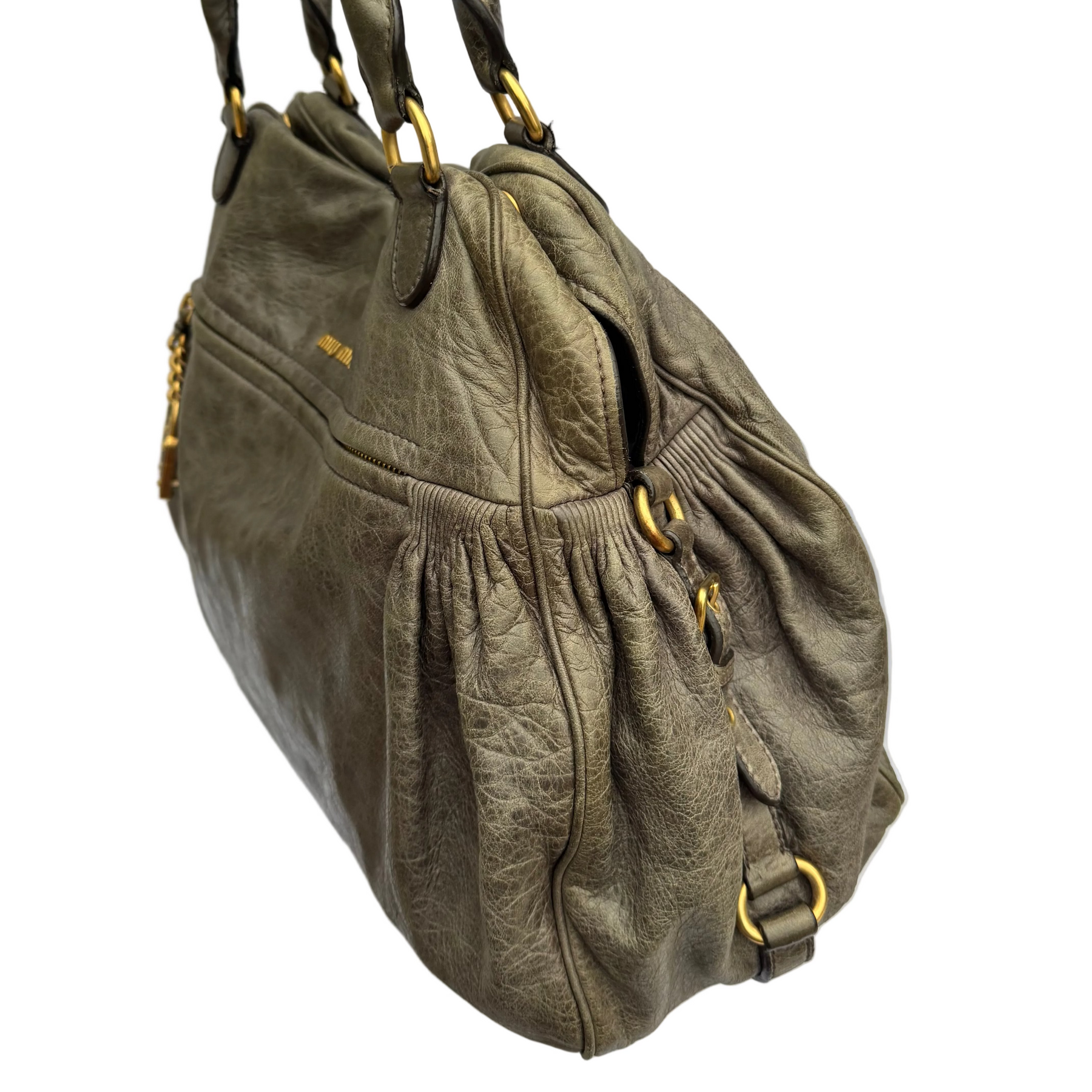 Model: Miu Miu Khaki Distressed Leather padlock Handle Bag in Grey