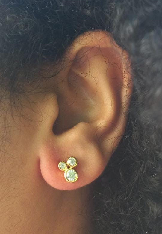 Cute handmade sterling silver stud earrings which are plated with 18 carat yellow gold. With a cluster of three cubic zirconia bubbles in a modern rub-over setting, they are perfect to wear every day for a little bit of sparkle. Looks great worn with our matching gold plated necklace and the perfect jewellery gift for those who love gold but not the price that goes with it.