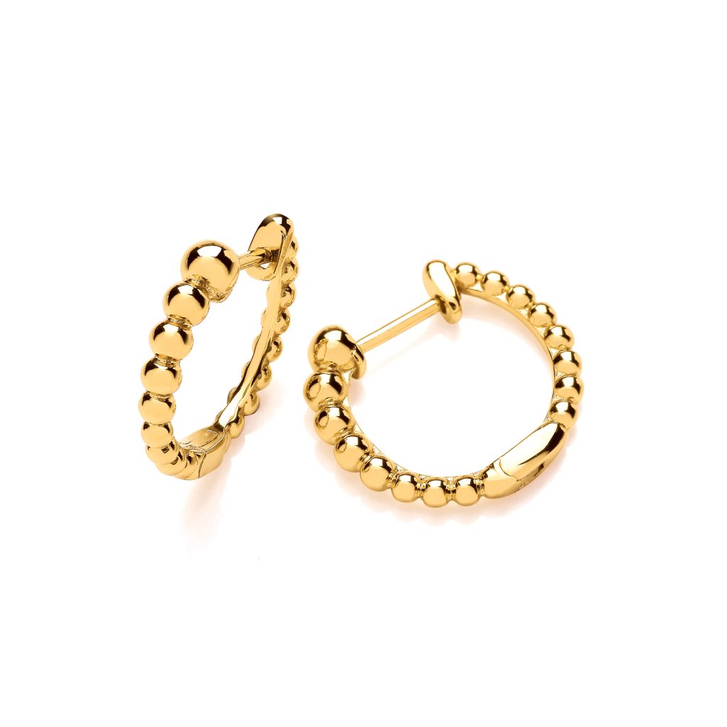 Lift your ear stack with these elegant gold vermeil huggie creole earrings, designed with a sleek row of graduated beads for a modern yet timeless look. Handmade in polished gold plated silver, their hinged fastening ensures a secure and comfortable fit. Perfect for wearing alone as a subtle everyday look or stacked with other earrings for a layered style, these versatile huggies add effortless style to any look.
