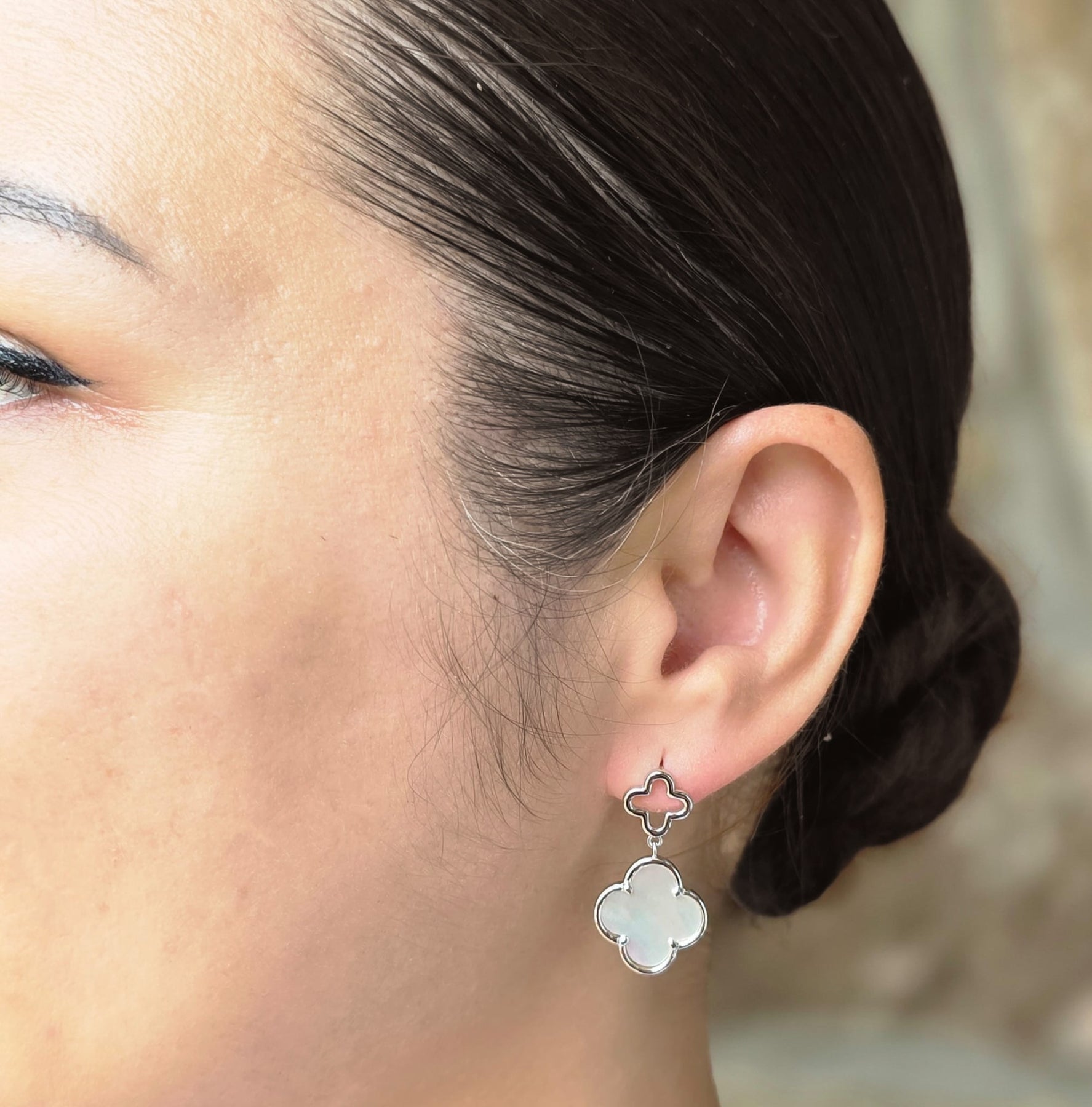 Sterling Silver, Rhodium Plated Mother of Pearl Clover Leaf Drop Earrings