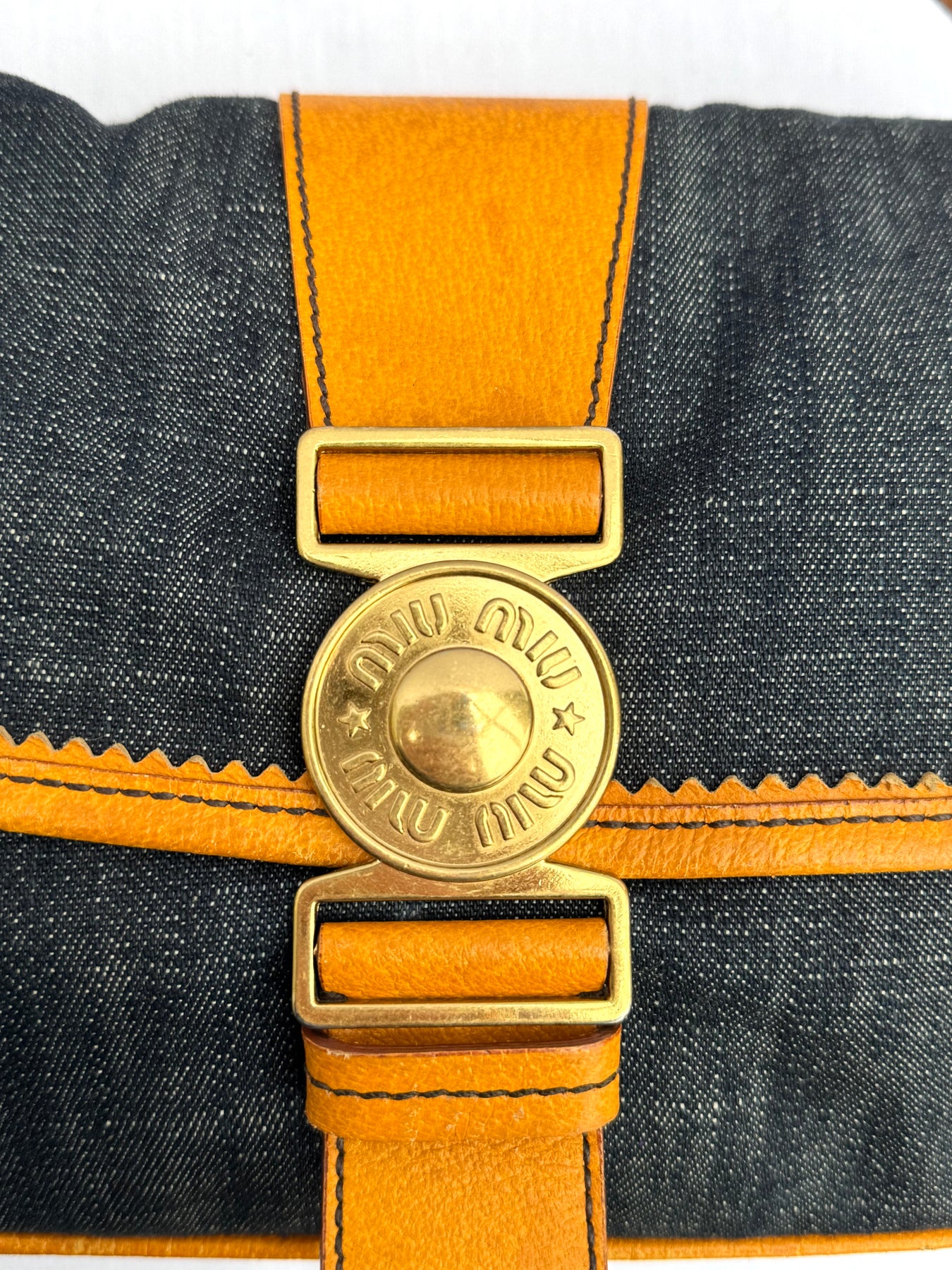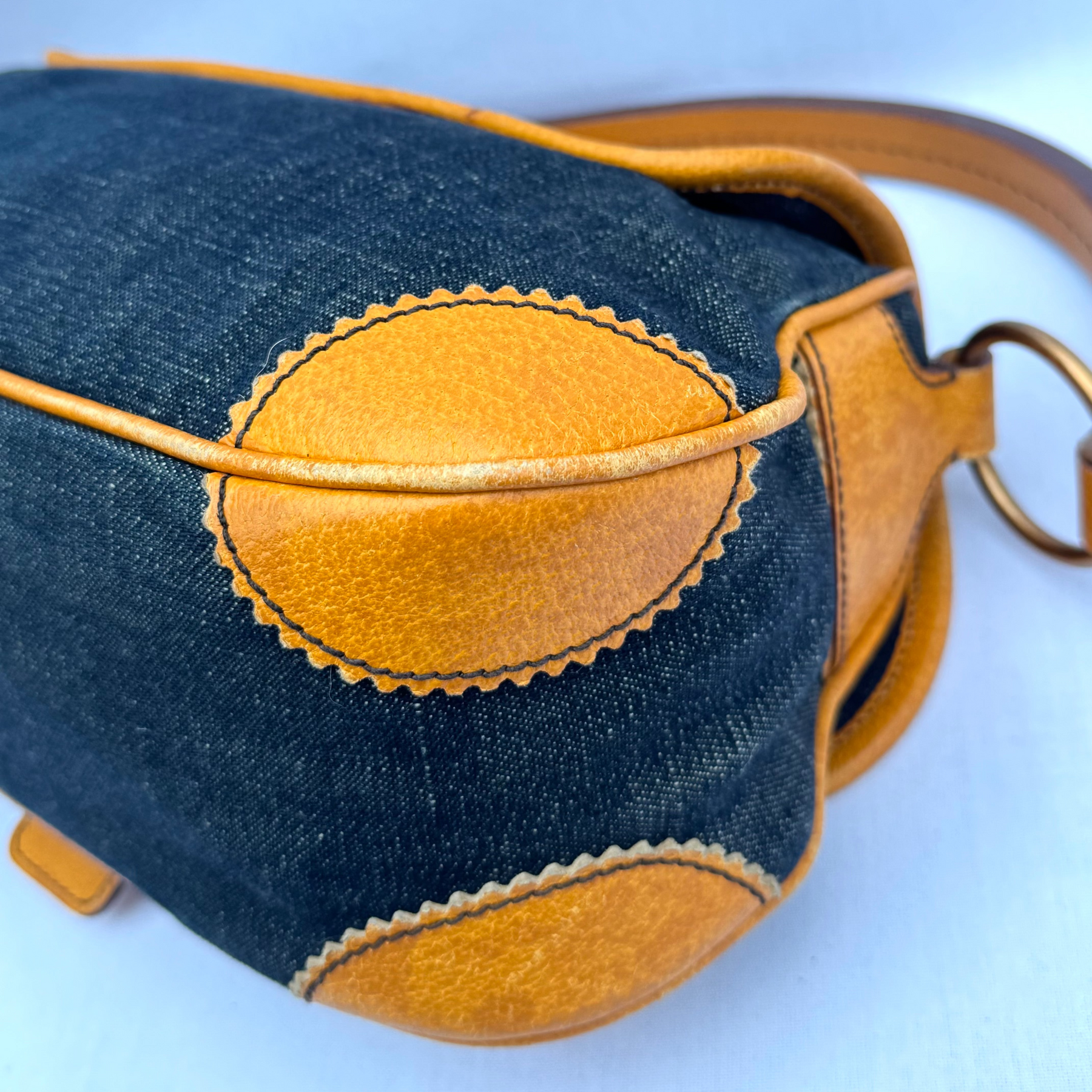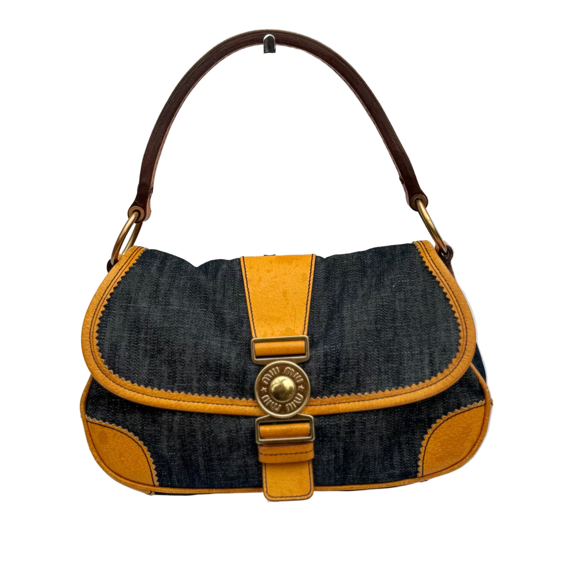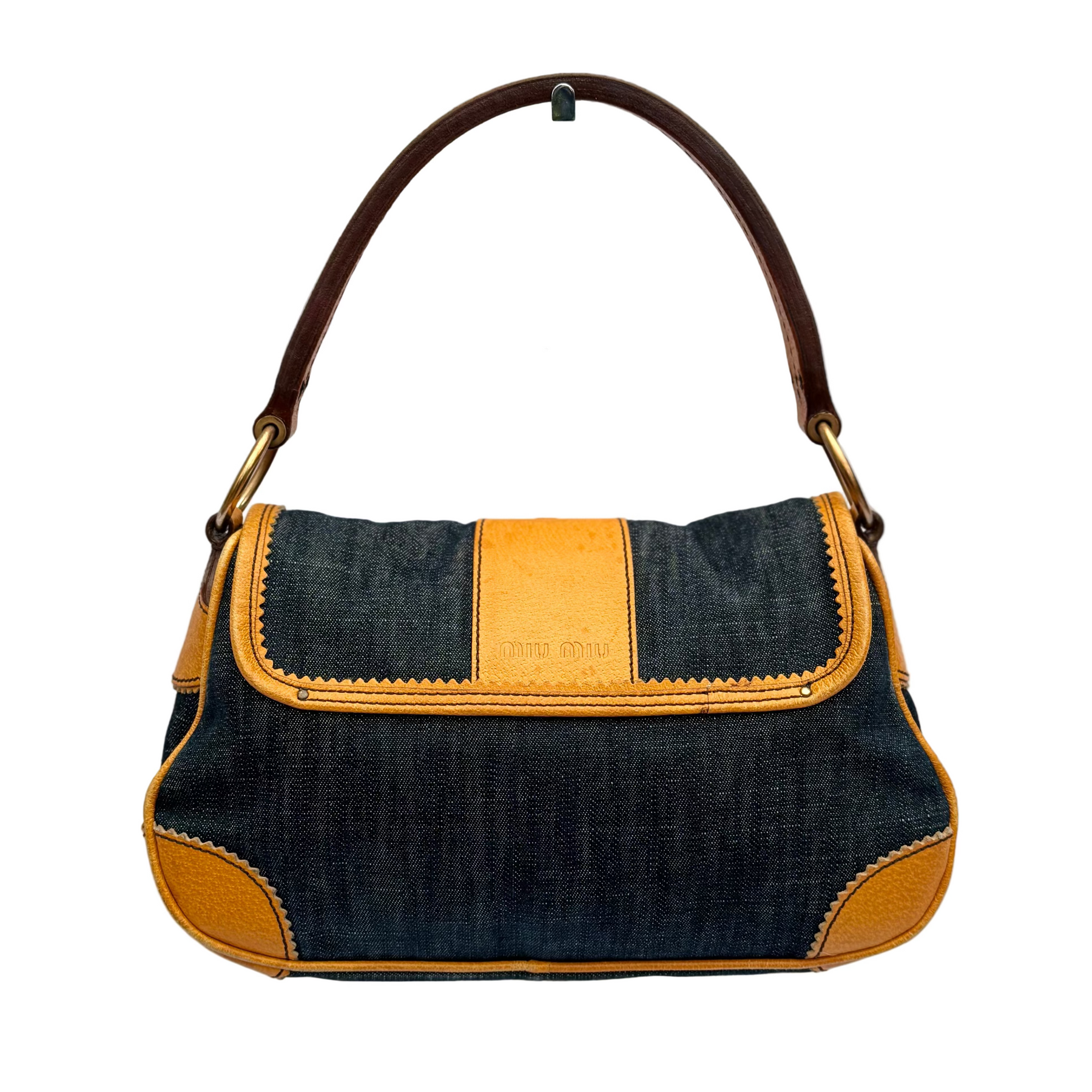 From the MIU MIU vintage archive, Crafted from deep indigo denim with rich caramel leather trim, this shoulder bag is unique and an investment piece. The scalloped flap and contrast stitching blends casual texture with refined detail, while the striking gold-tone medallion clasp exudes luxury