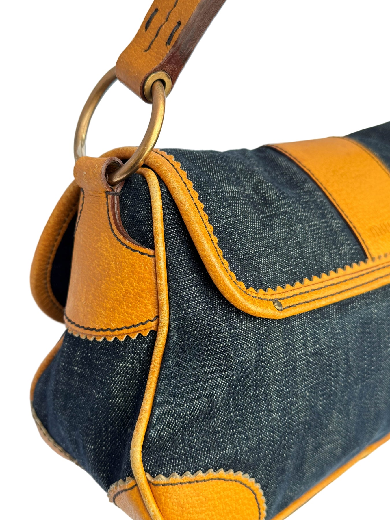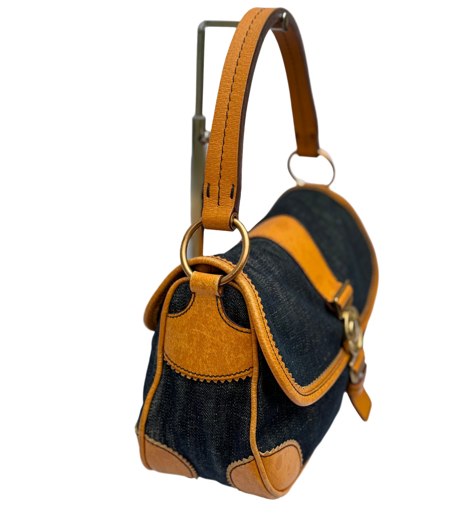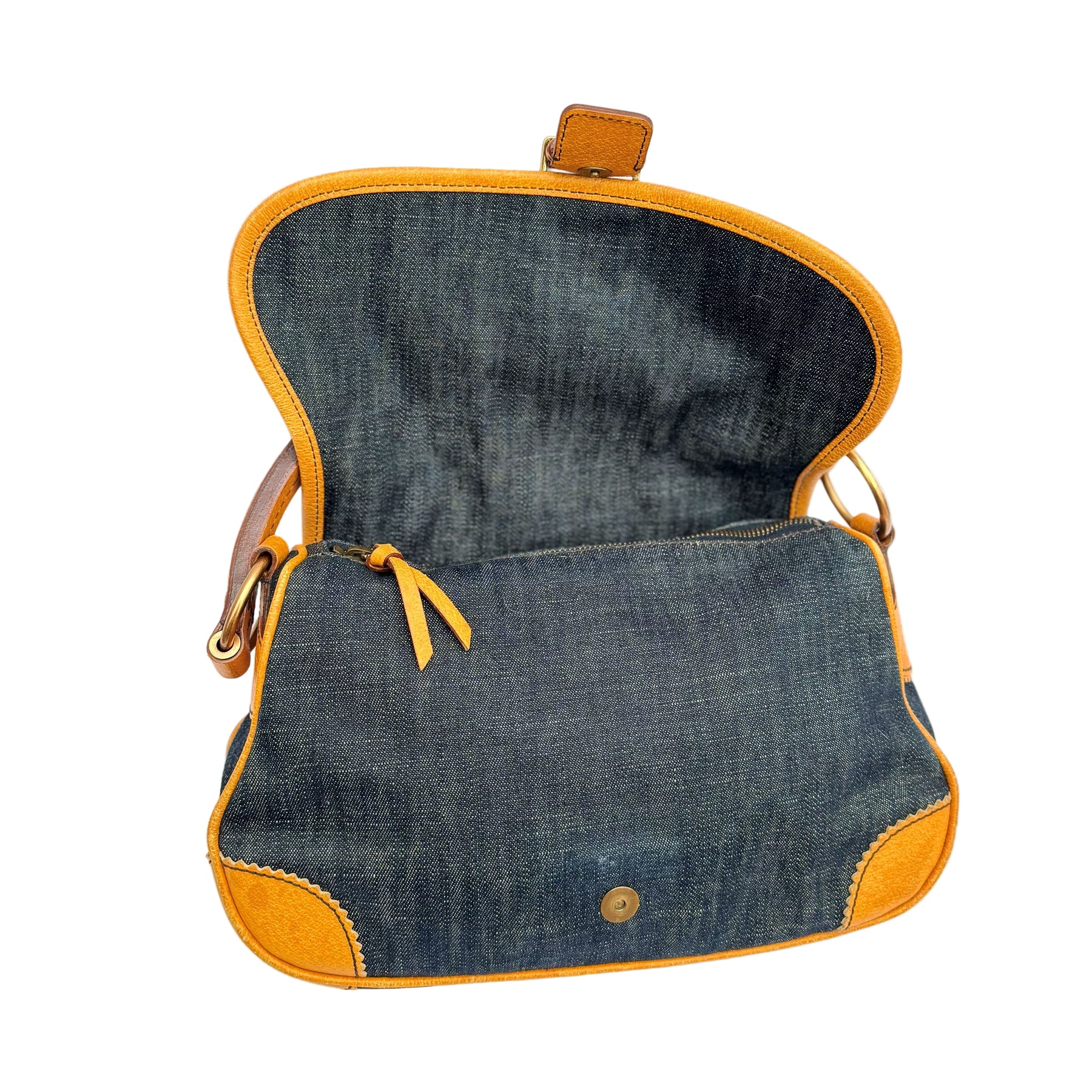From the MIU MIU vintage archive, Crafted from deep indigo denim with rich caramel leather trim, this shoulder bag is unique and an investment piece. The scalloped flap and contrast stitching blends casual texture with refined detail, while the striking gold-tone medallion clasp exudes luxury