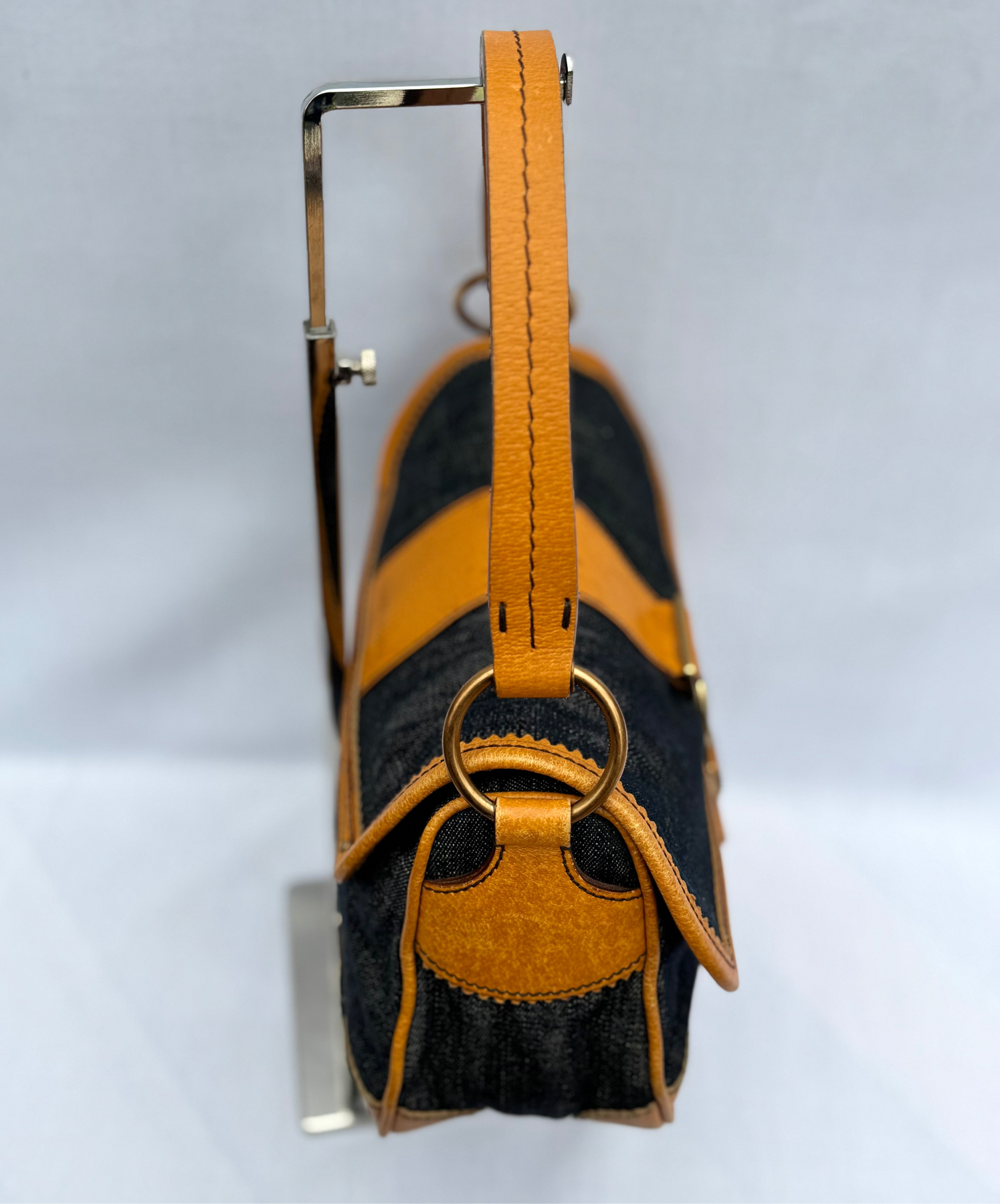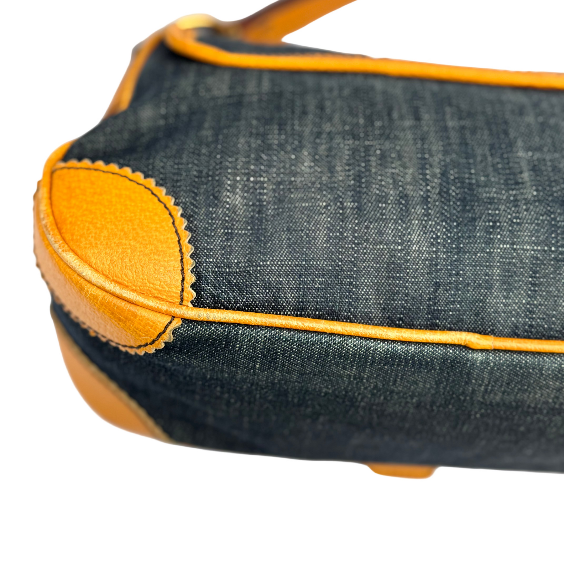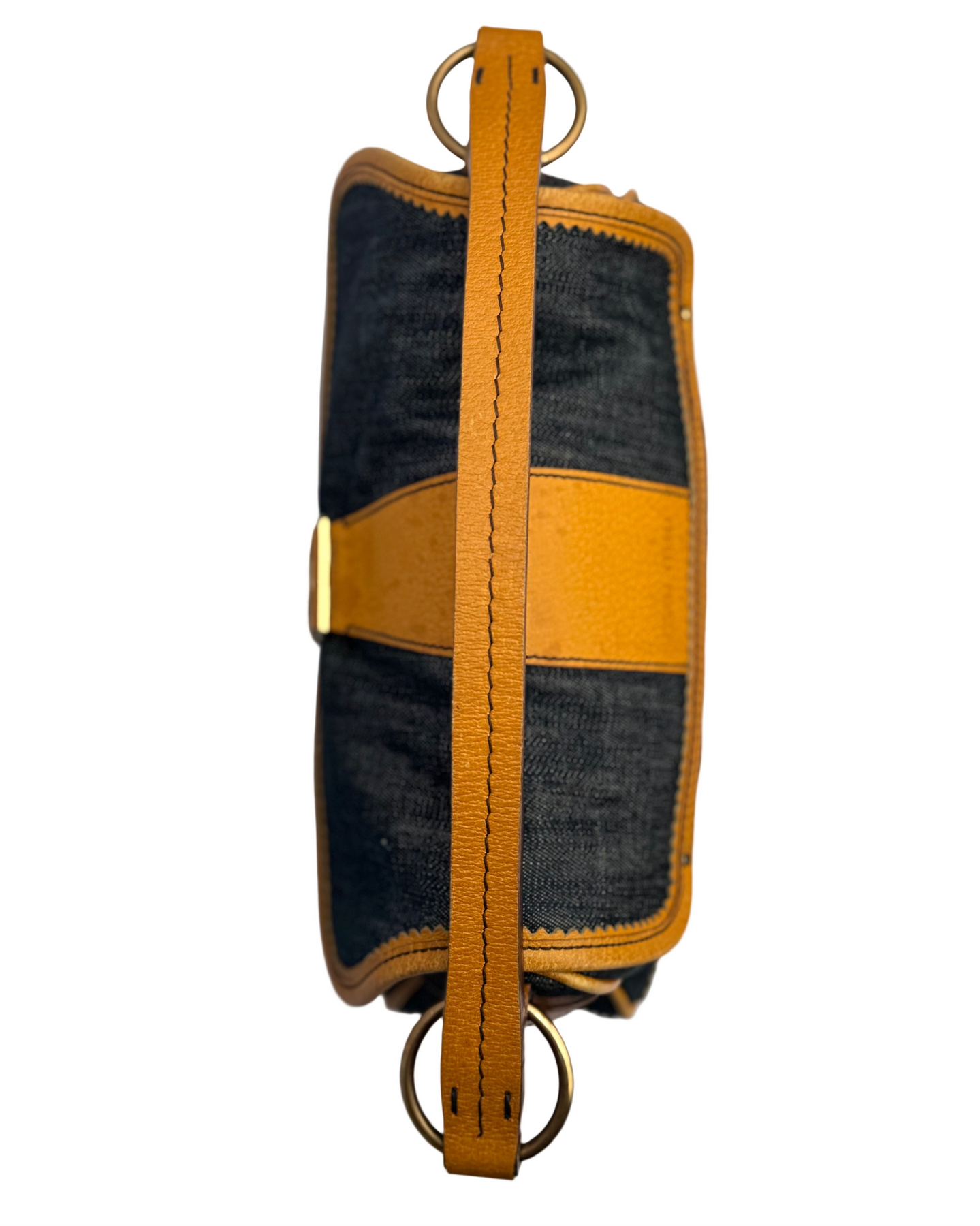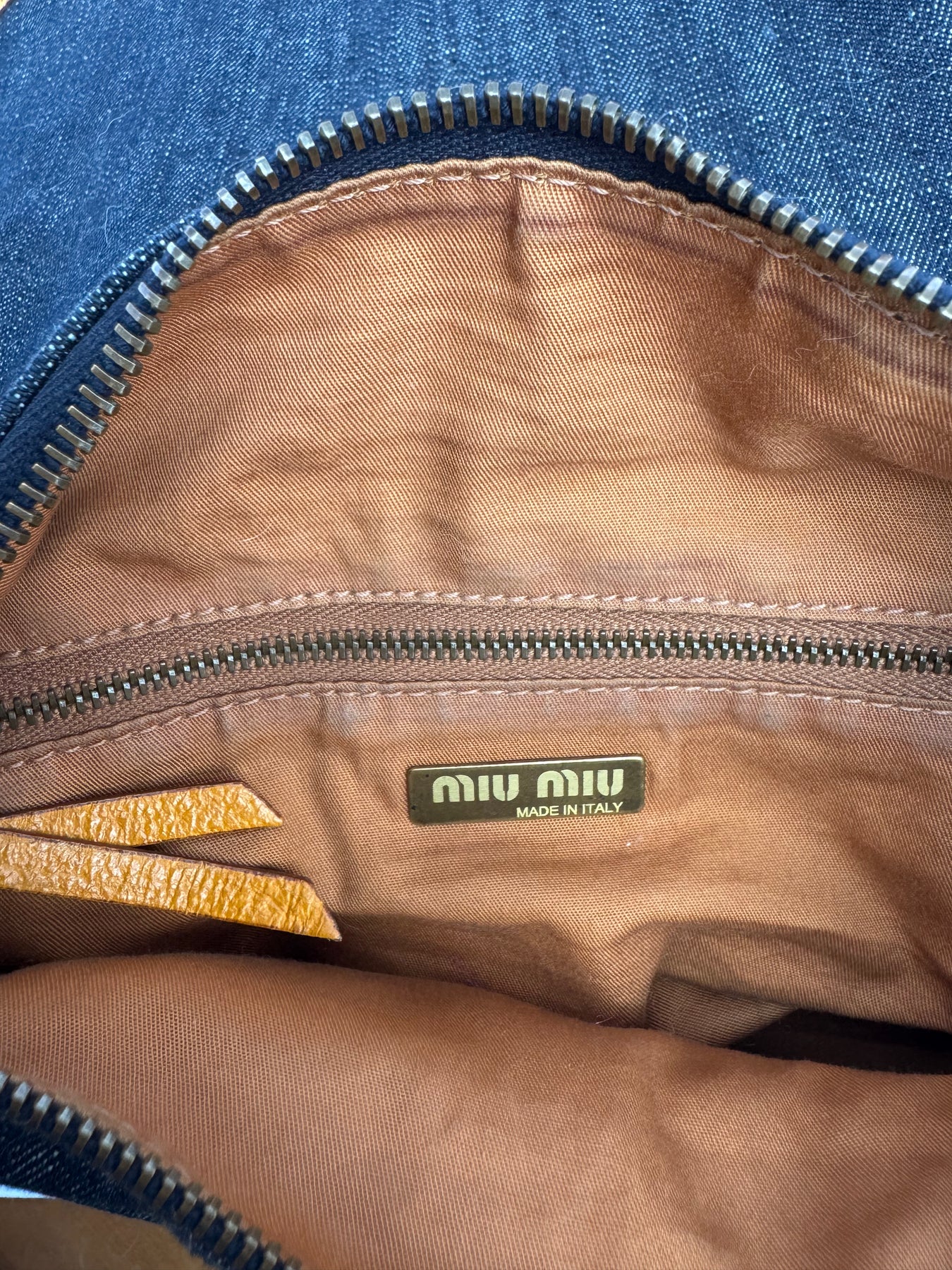 From the MIU MIU vintage archive, Crafted from deep indigo denim with rich caramel leather trim, this shoulder bag is unique and an investment piece. The scalloped flap and contrast stitching blends casual texture with refined detail, while the striking gold-tone medallion clasp exudes luxury
