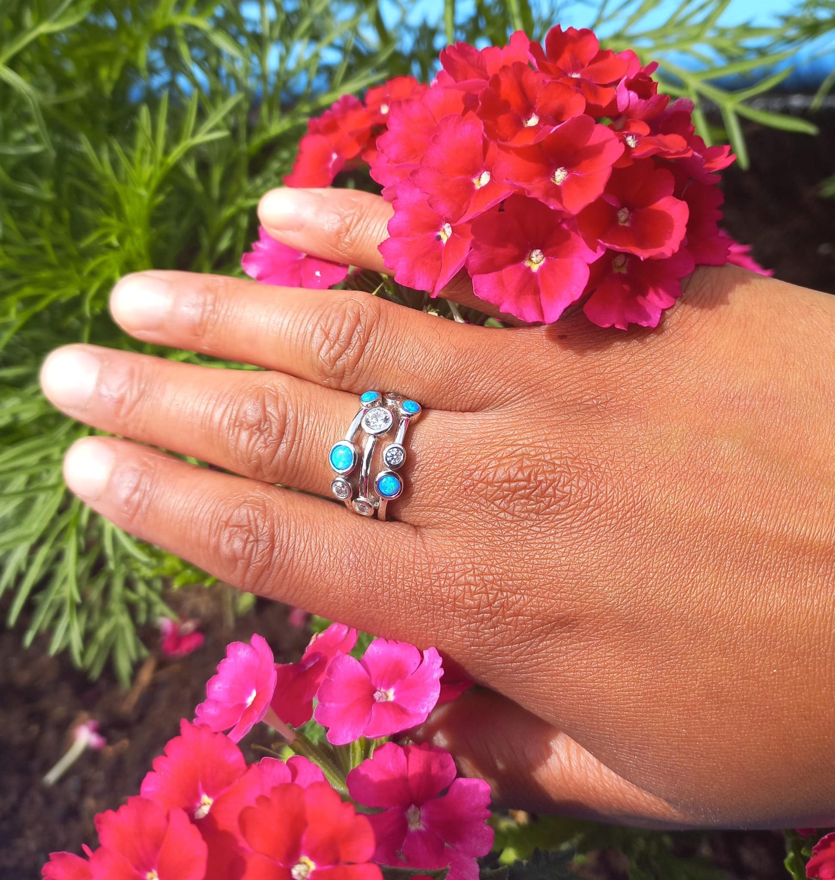 Sterling Silver & Cubic Zirconia & Blue Opalique Triple Band Bubble Ring