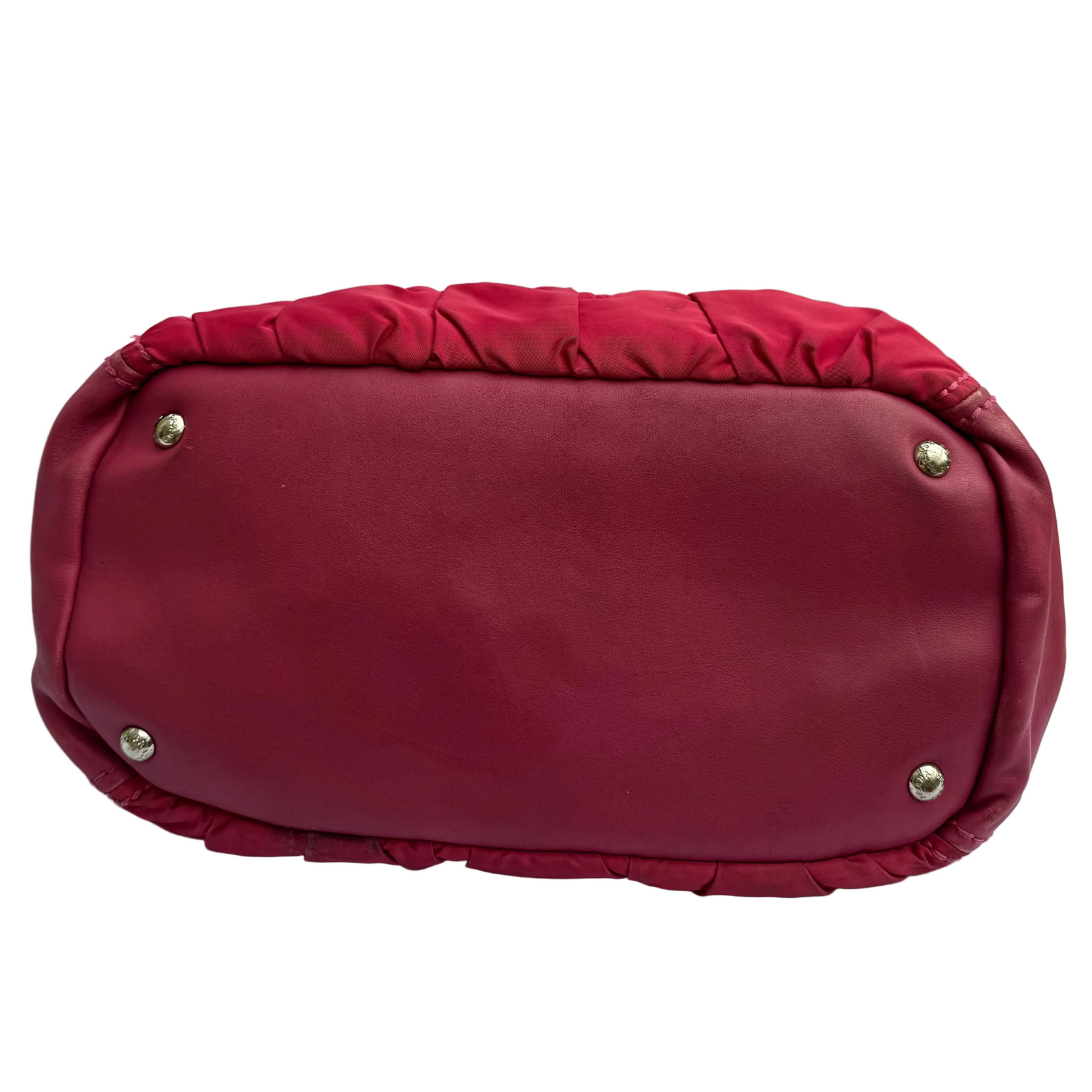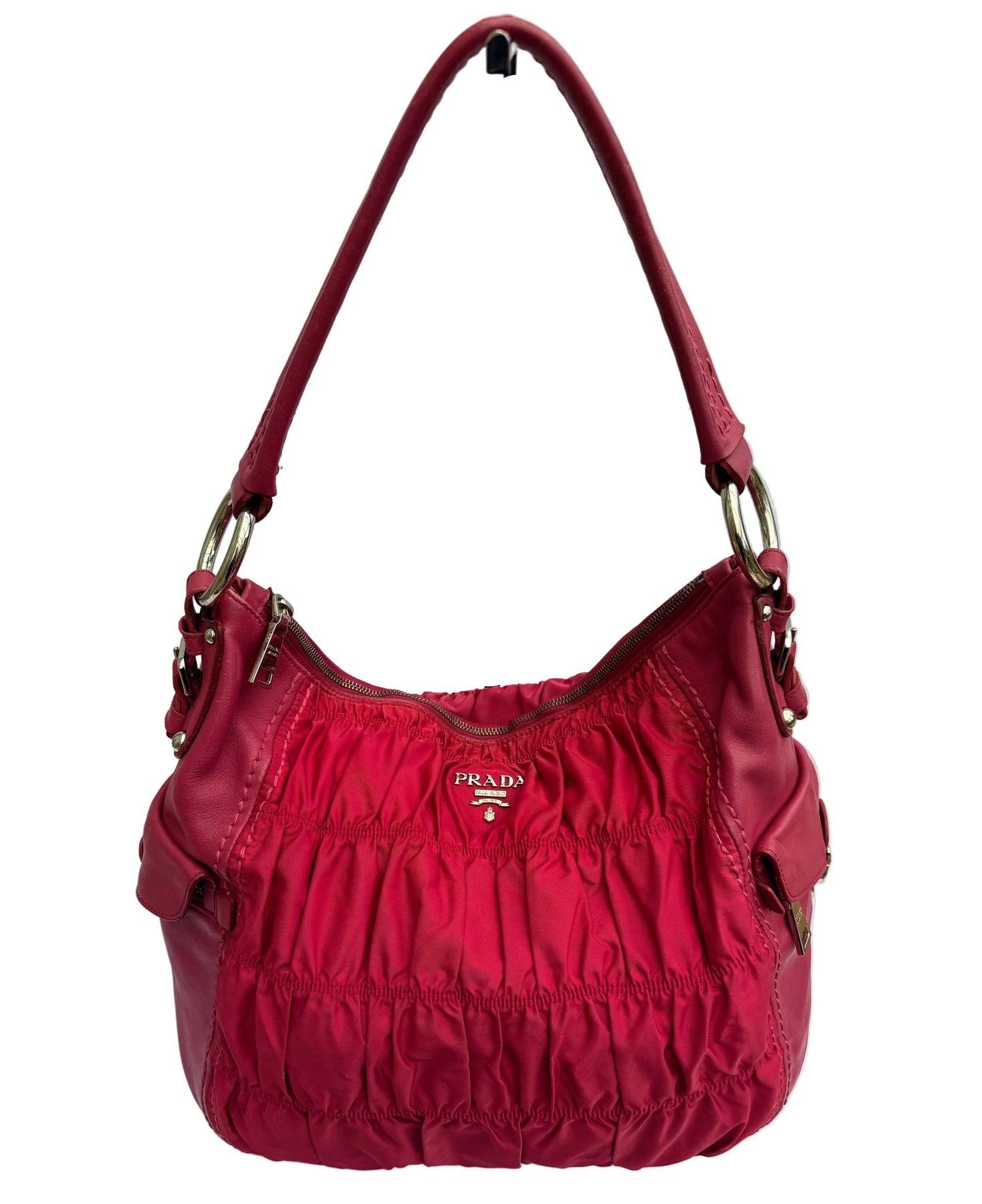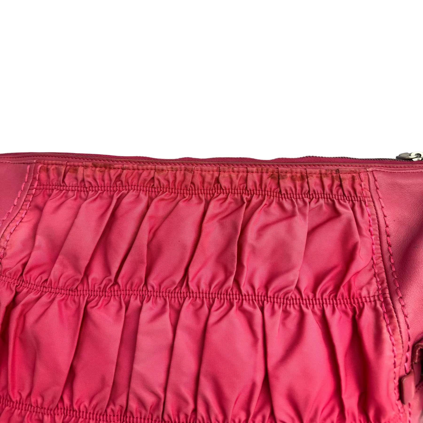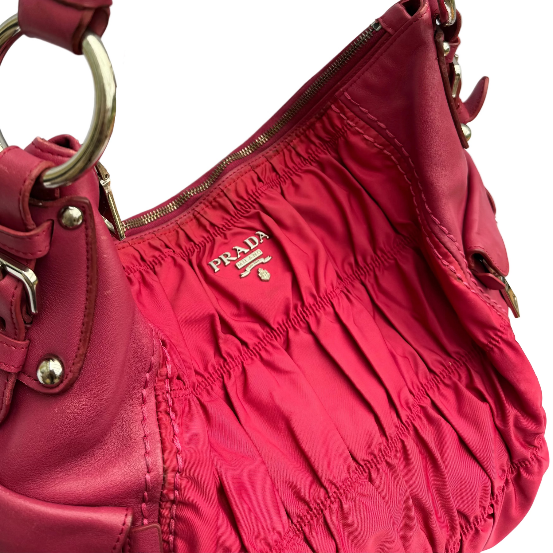 Details: The Prada Tessuto Gaufre Hobo bag in subtle fuchsia blends leather with signature ruched nylon for a soft, slouchy silhouette. Featuring a spacious interior, two large secure side pockets, and polished silver-tone hardware, it’s a relaxed yet practical piece for busy days.