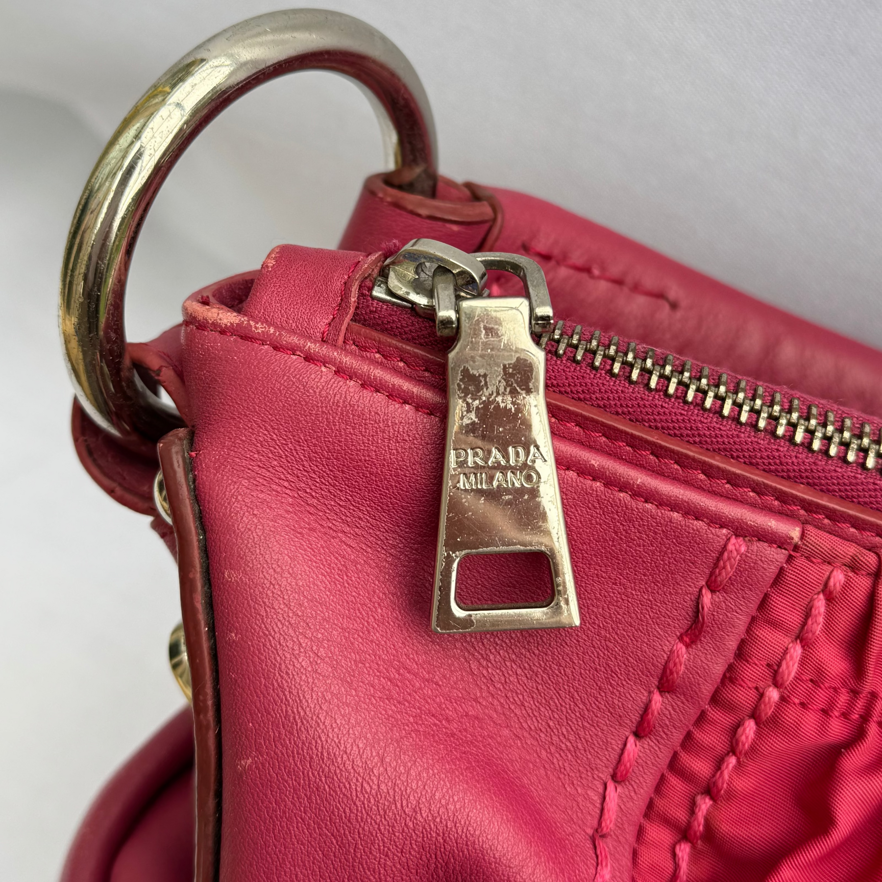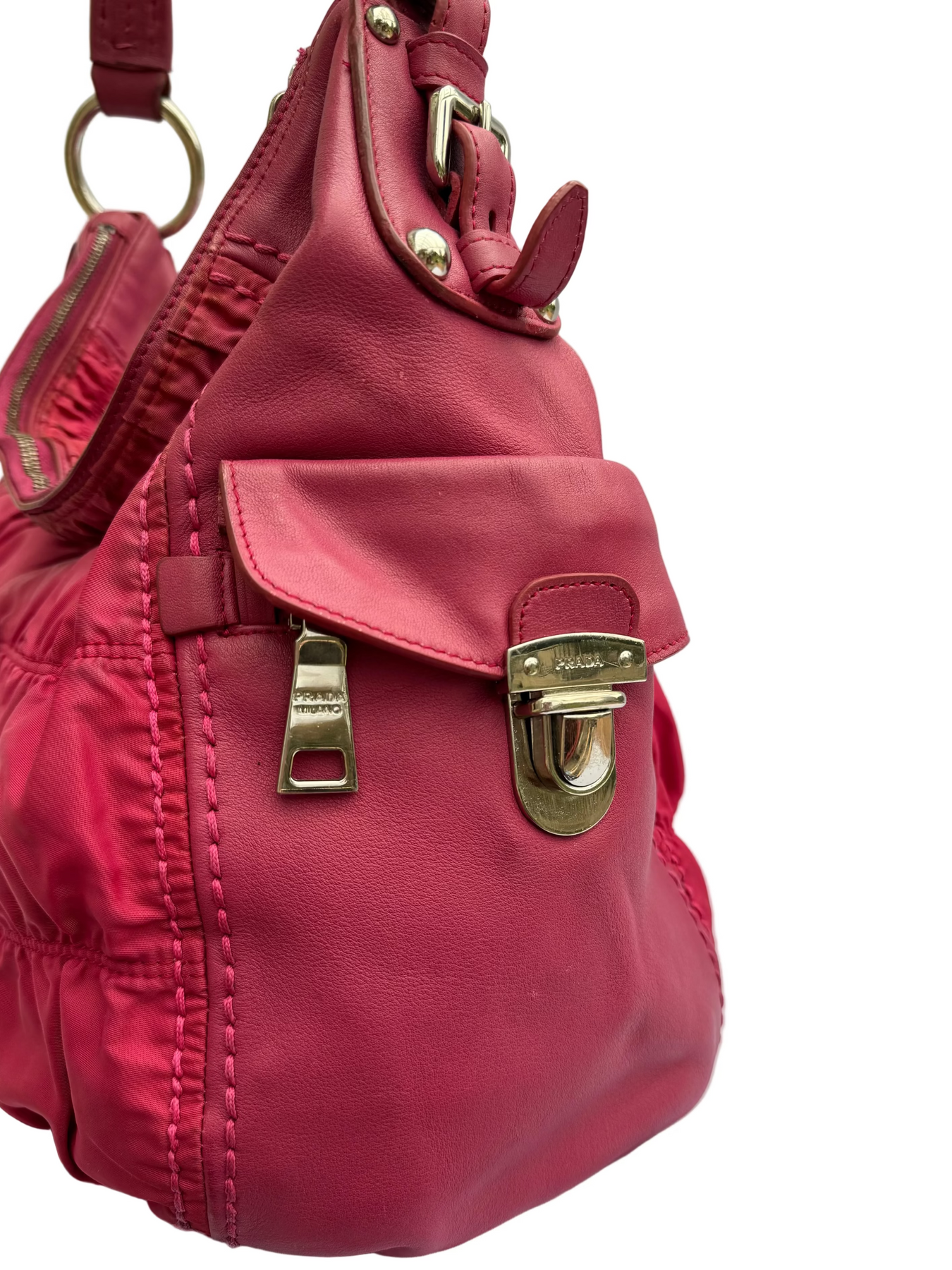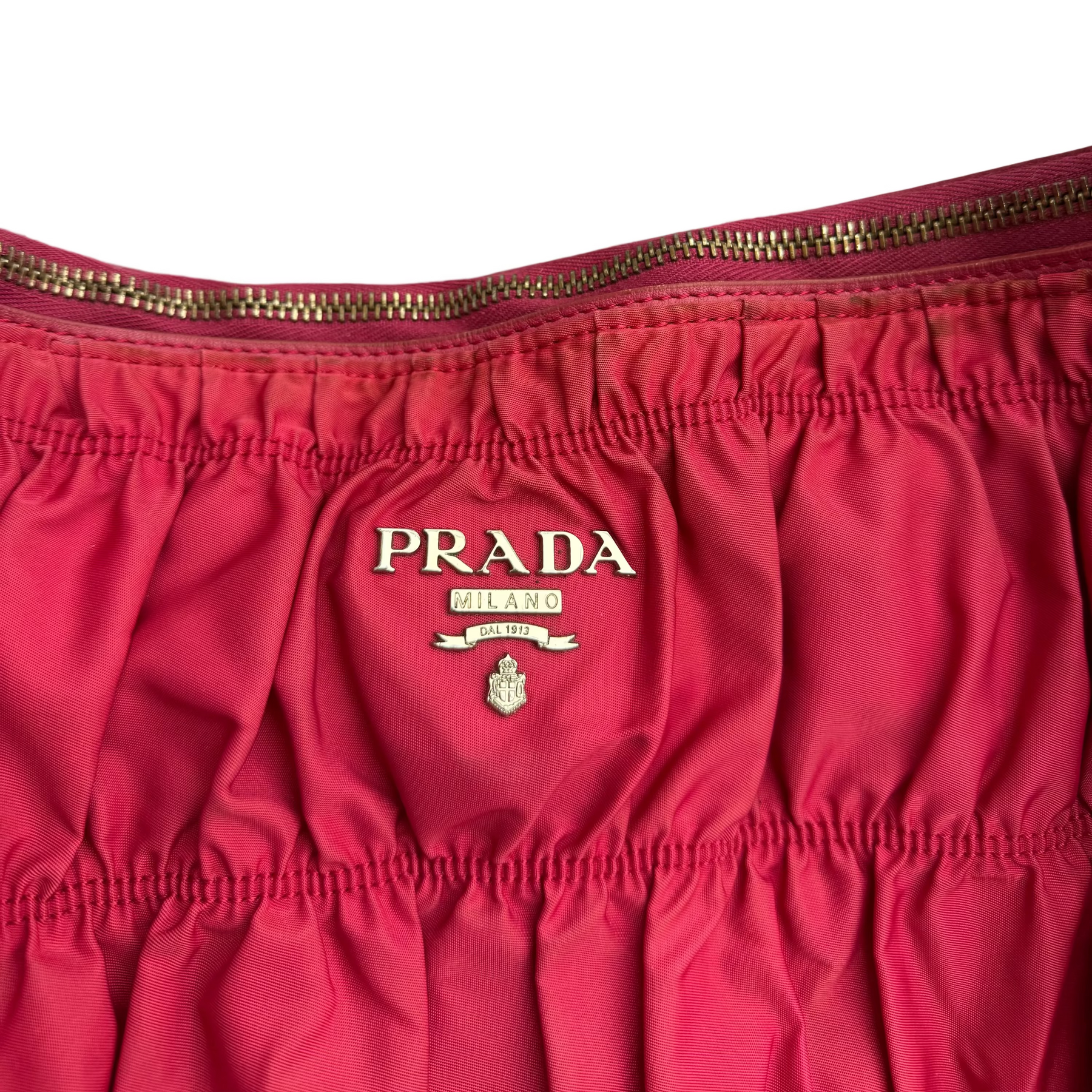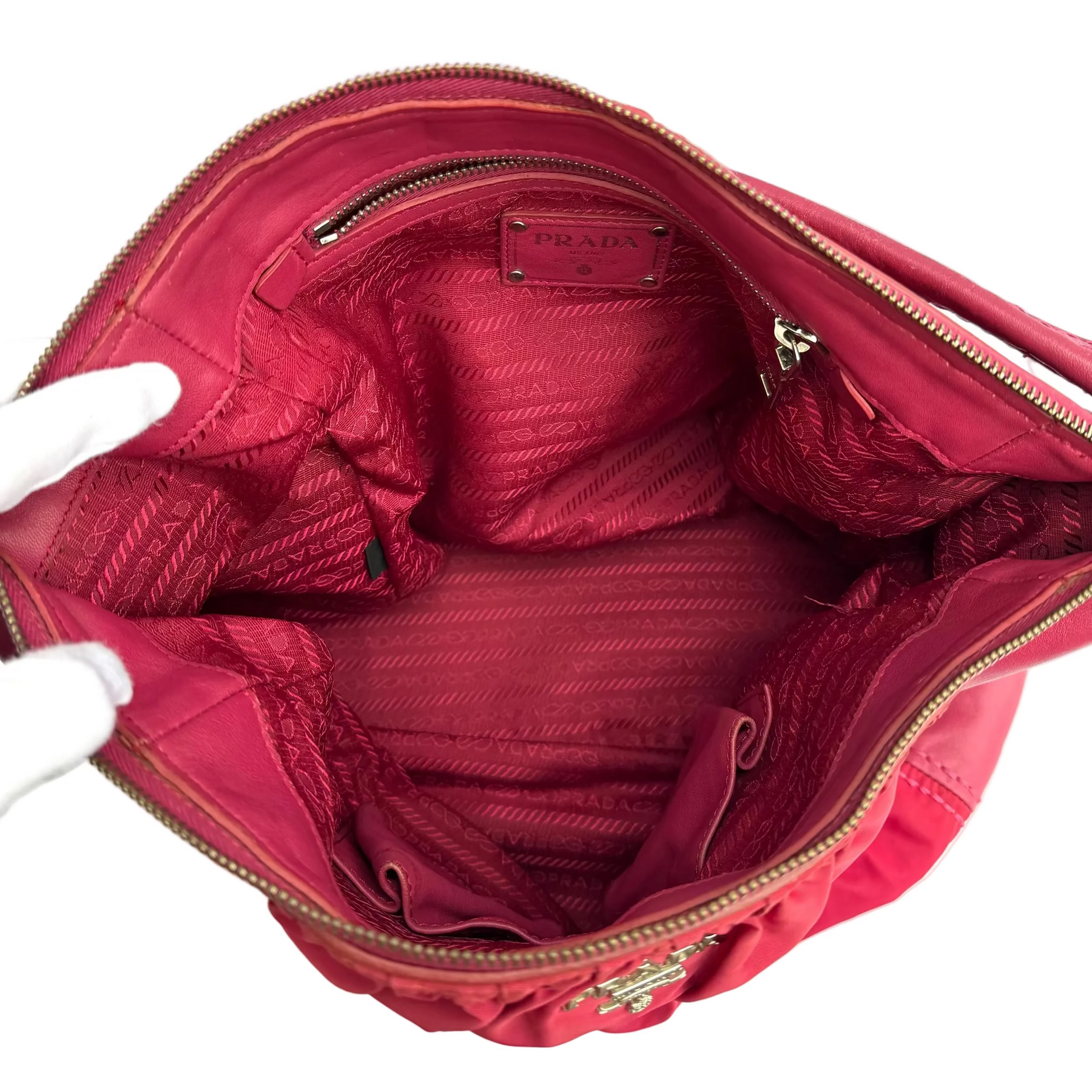 Details: The Prada Tessuto Gaufre Hobo bag in subtle fuchsia blends leather with signature ruched nylon for a soft, slouchy silhouette. Featuring a spacious interior, two large secure side pockets, and polished silver-tone hardware, it’s a relaxed yet practical piece for busy days.