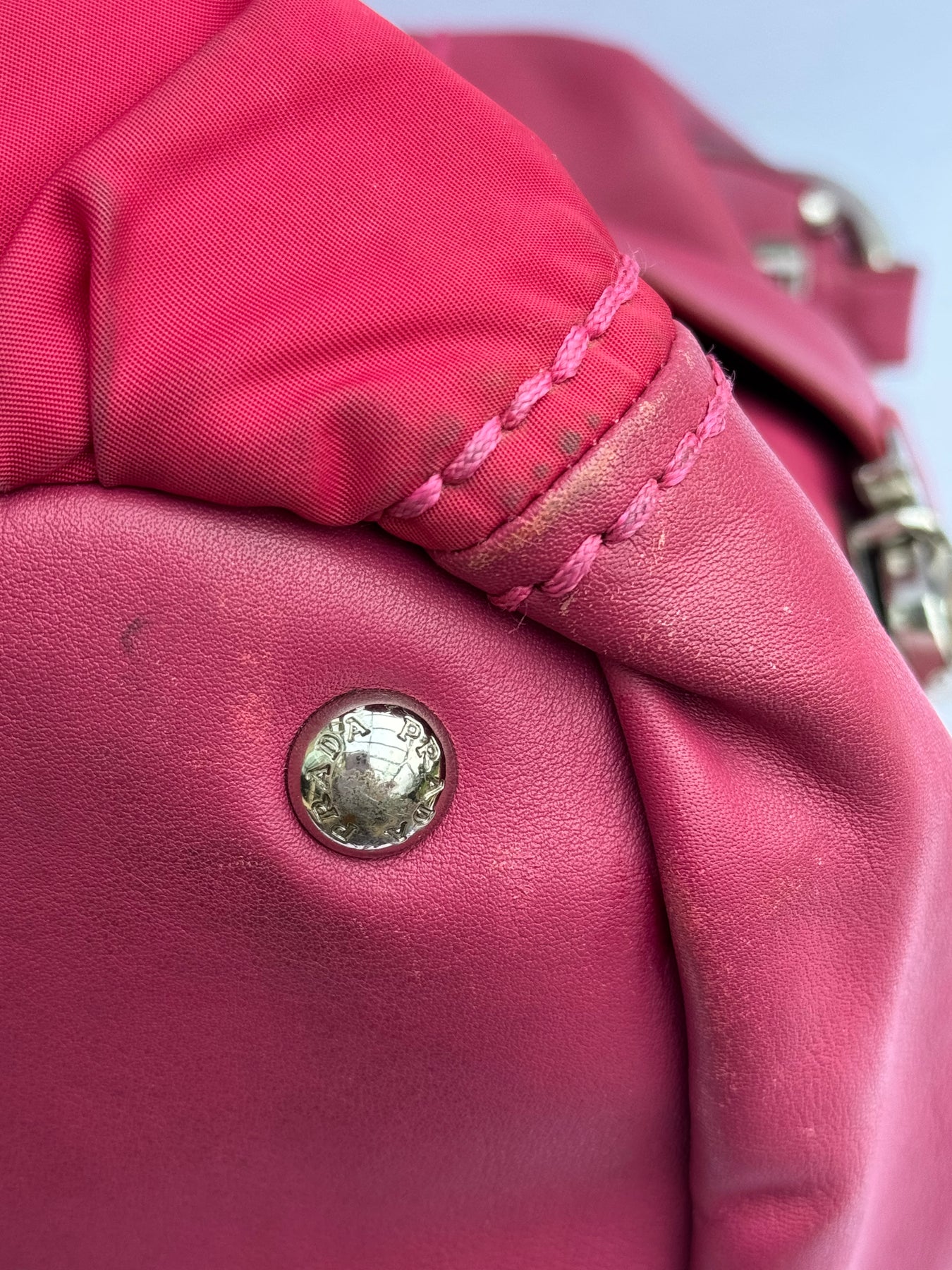 Condition Report - This item has been previously owned and shows visible signs of vintage wear. Including, discolouration to the nylon fabric at the hem of the bag, small scuffs and signs of wear to the front and back panels, and wear to the leather on the bottom panel.