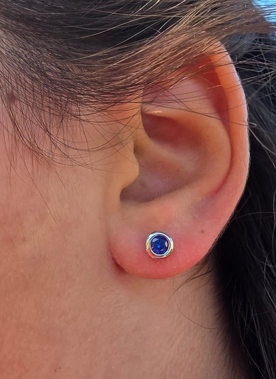 Elegant sapphire blue cubic zirconia and sterling silver solitaire stud earrings, set into a modern open-backed sterling silver setting, making them stand proud from your ear rather than lying flat against it. Size 1/4 carat (4mm) Rhodium plated to prevent tarnishing.
