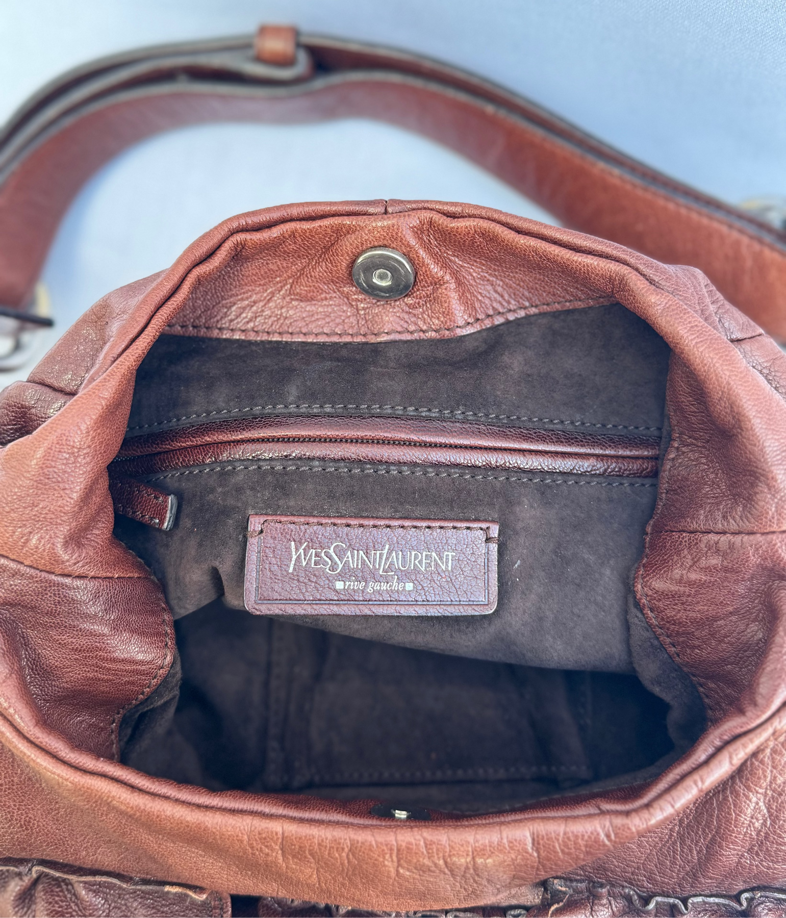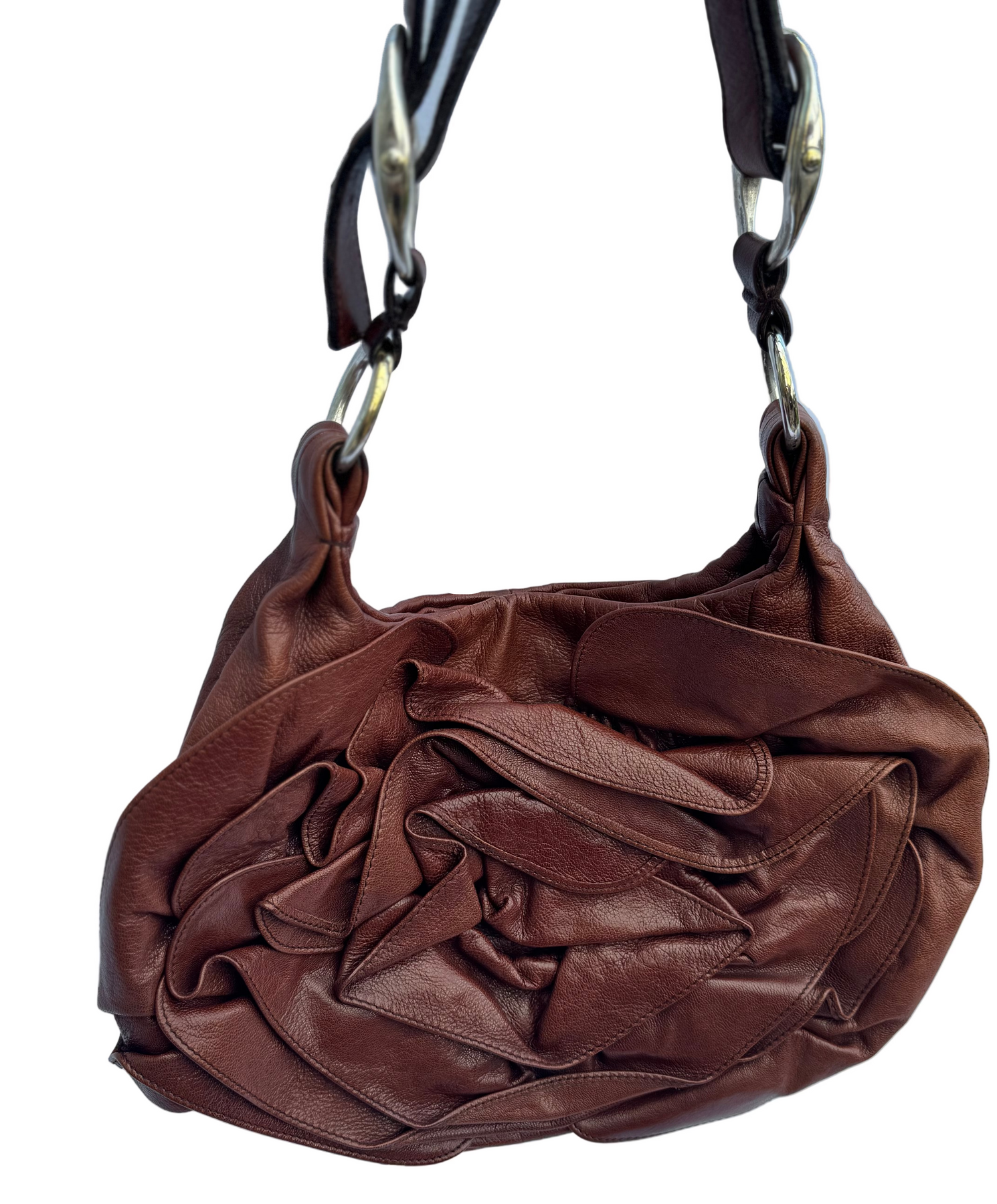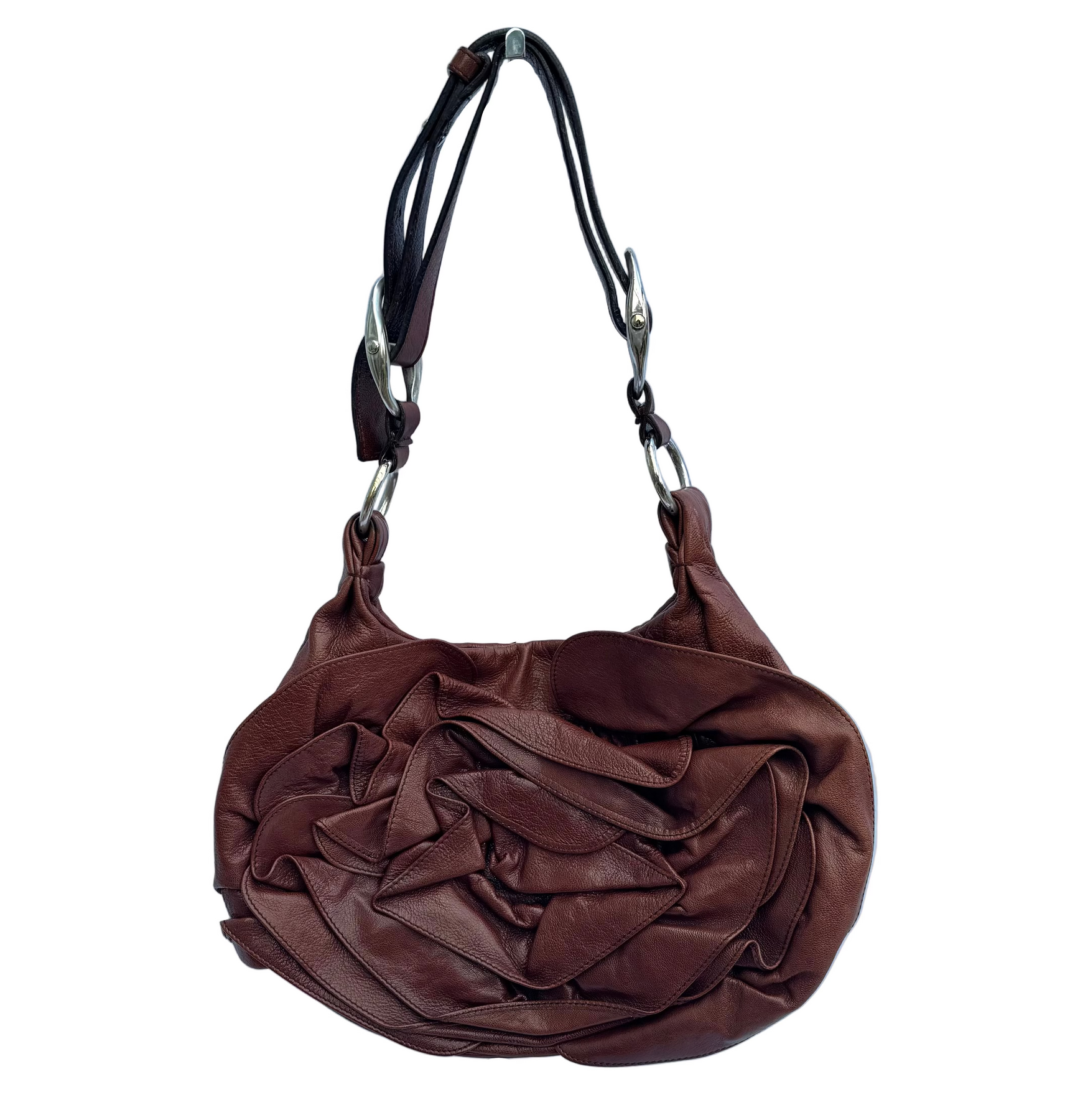 Designed by Tom Ford for YSL in 2003, the Nadja Rose Bag is a standout early-2000s piece crafted from rich brown leather with a sculpted rose design. Featuring a chic hobo silhouette and suede-lined interior, it’s a statement vintage gem — and an increasingly trendy collector’s favourite.